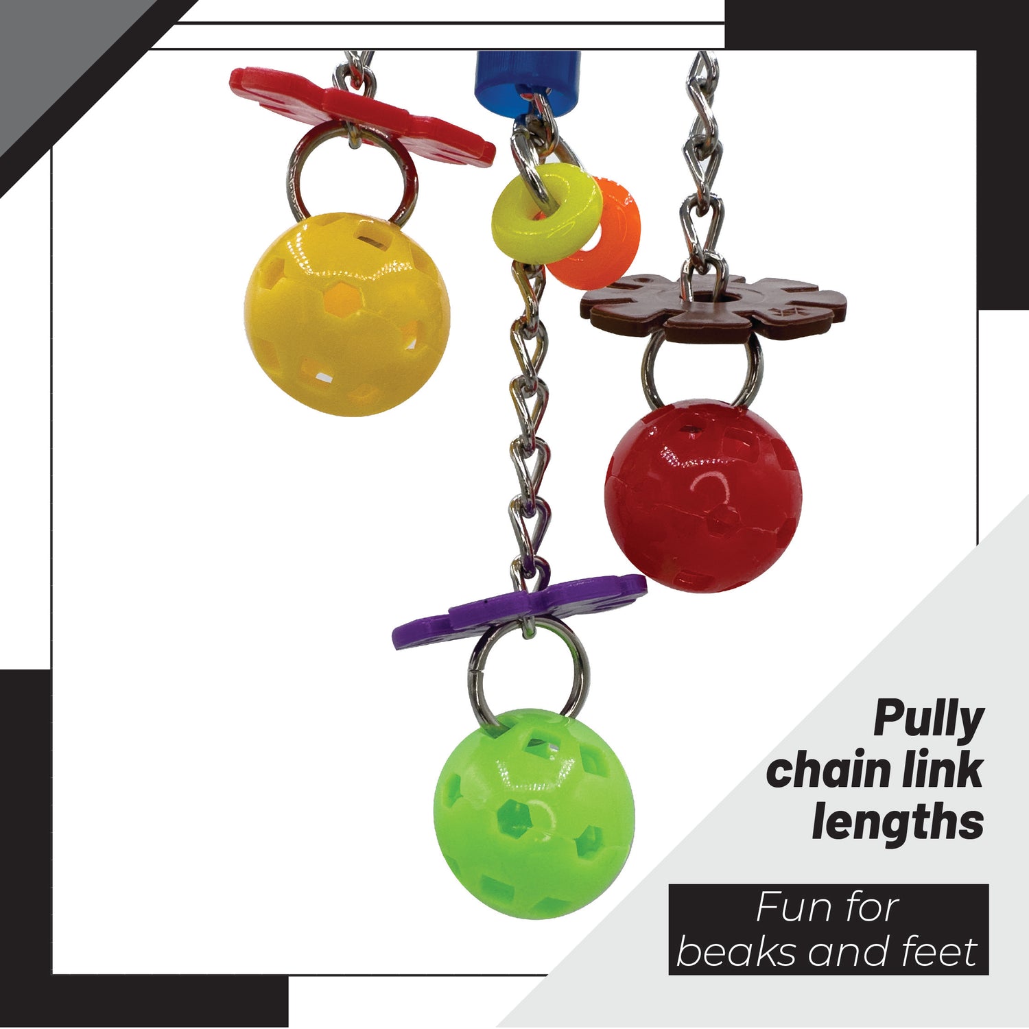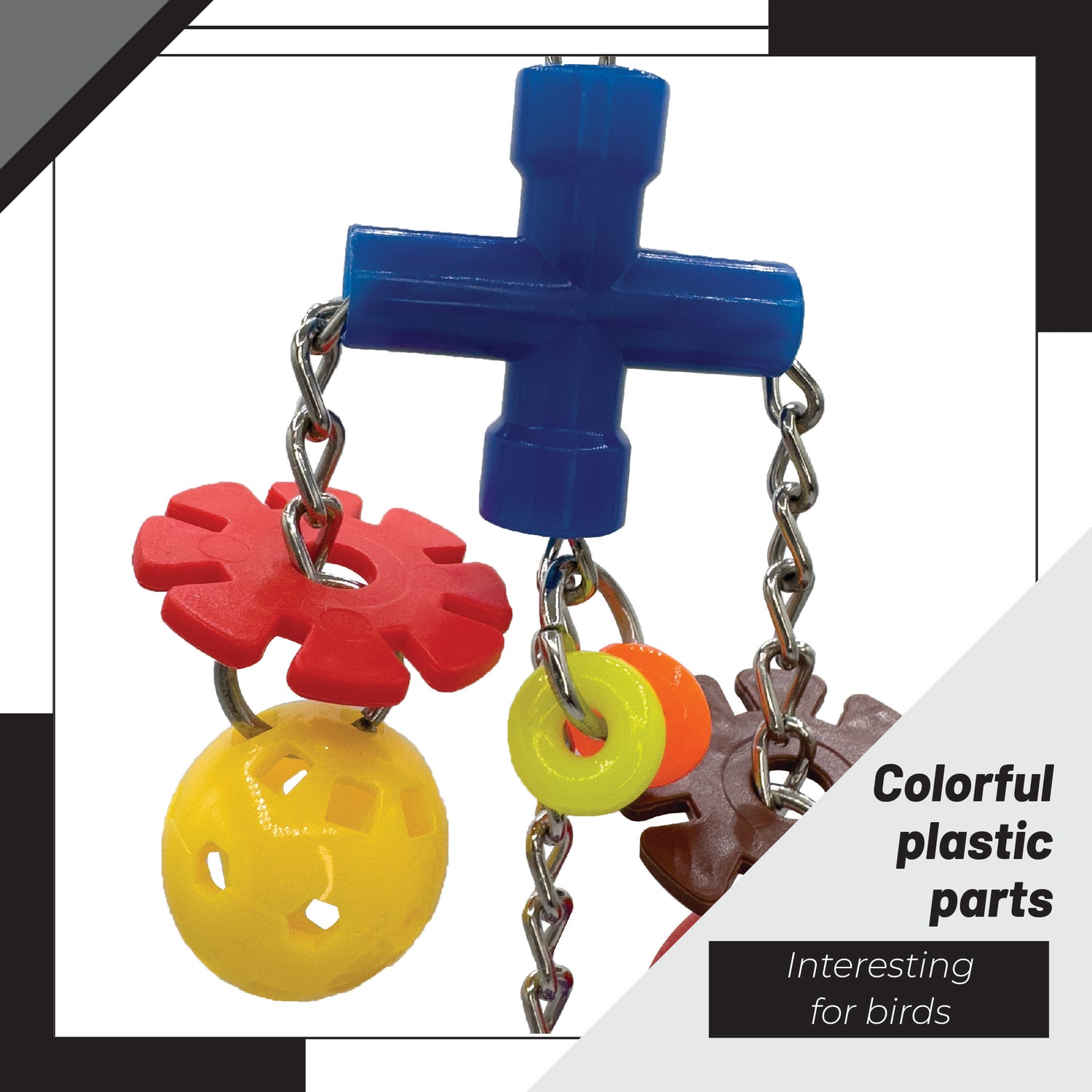 At the top, a sturdy quick-link connector allows for quick and secure installation in any cage. From there, a strong plastic cross sits at the center of the toy, serving as a stable base for four metal chains that hang from each arm. These chains hold colorful plastic balls and flower-shaped gear charms that sway freely when nudged.