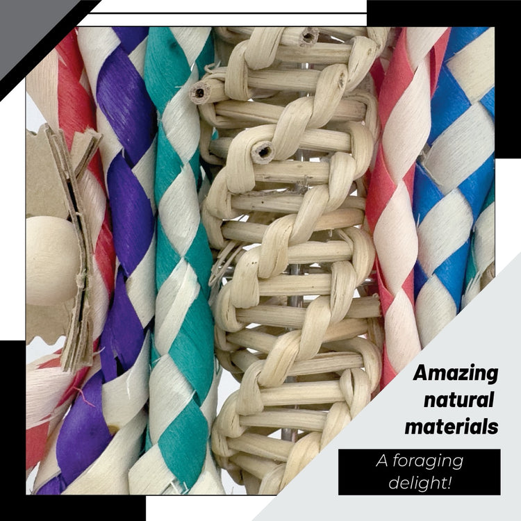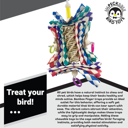 At the top, a durable quick link connector provides a secure and easy way to hang the toy. The center features a coiled vine twist, giving birds a satisfying natural surface to nibble and chew. Surrounding this vine core are colorful bamboo finger traps that create a layered and shreddable look birds find irresistible. Lightweight plastic rings and accent beads dangle from the sides, gently moving as your bird interacts with the toy.