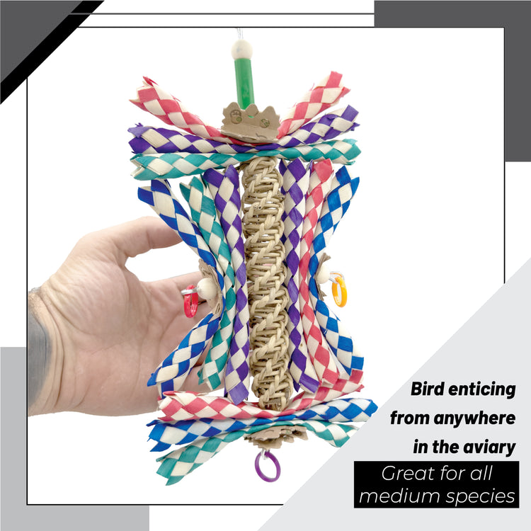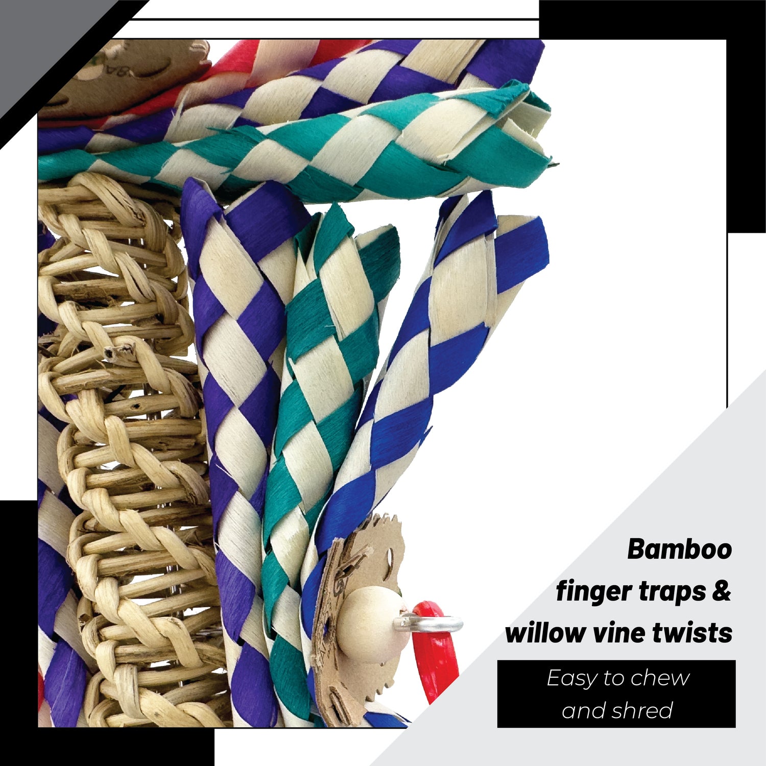 At the top, a strong nickel-plated quick link securely attaches the toy to your bird’s cage. From there, a twisted vine serves as the core, offering a soft yet chewy texture perfect for nibbling and unraveling. Wrapped around this core are multiple layers of colorful palm strips and bamboo finger traps, creating an exciting texture combination for birds to shred, pull, and peck.