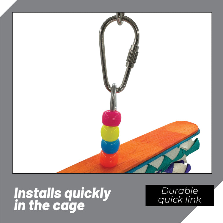 Starting at the top, a stainless steel quick link offers a safe and easy cage attachment. The toy is built around a sturdy wire core threaded with colorful plastic pony beads, giving the piece movement and visual appeal. On either end, chewable wood slats sandwich a stack of soft bamboo finger traps that birds love to shred. A rubber ring at the bottom completes the toy, adding a playful swinging motion and giving birds something to pull or grip.