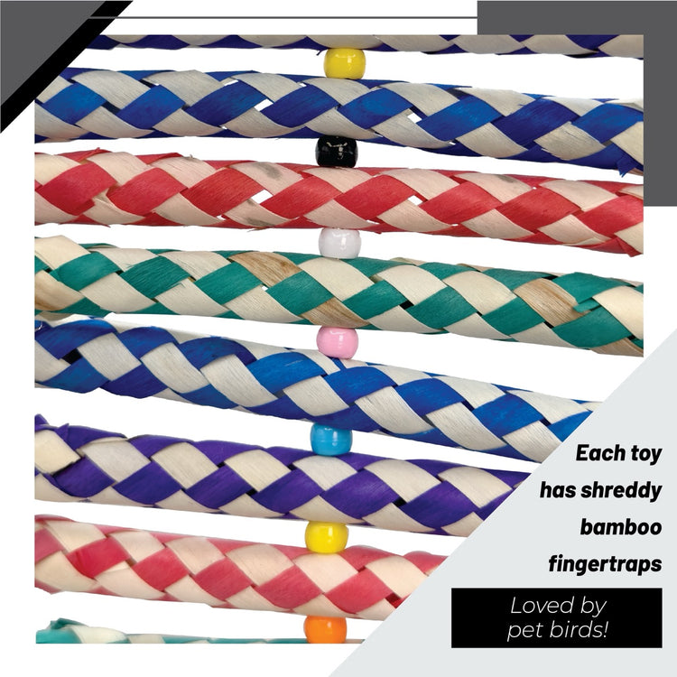 The 1246 Pk3 Fingertrap Shredders come in three vibrant designs, each featuring a mix of bamboo finger traps, foam, wood, and beads. With a variety of textures and colors, these toys provide an engaging shredding and chewing experience that encourages natural foraging behaviors. Perfect for small to medium-sized birds, they help prevent boredom, promote mental stimulation, and support healthy beak maintenance. Each toy offers a unique shape and material combination, keeping playtime fresh and exciting for your feathered friend.