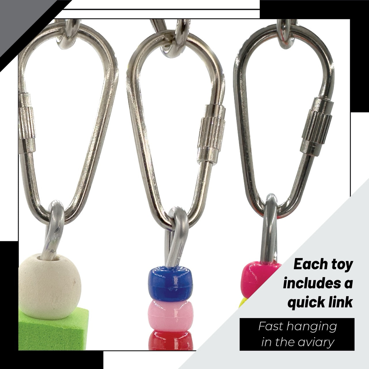 These toys are designed to hung from a bar or rung in a birds cage. Each small bird cage toy includes a quick link hanging connector for fast installation in the aviary.