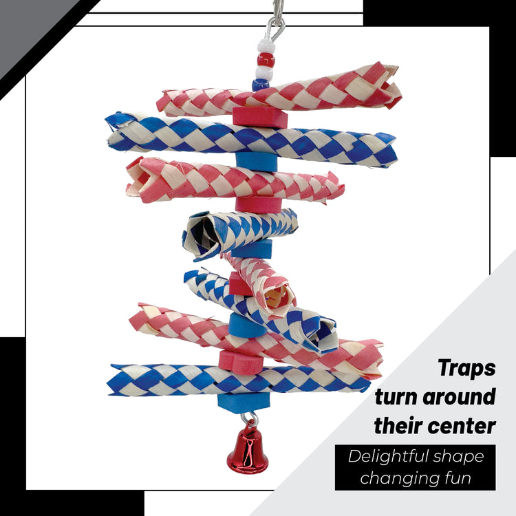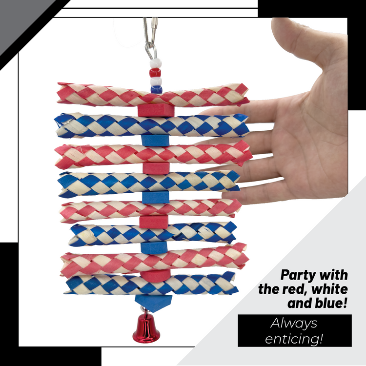 Introducing the 1248 Star Spangled Fingertrap Shredder from Impeckable Bird Toys. This festive cage toy adds red, white, and blue color, sound, and shredding action to enrich any bird's environment.