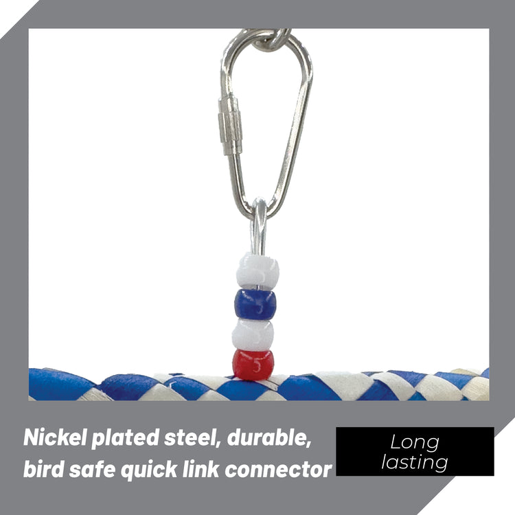 The 1248 Star Spangled Fingertrap Shredder features a sturdy metal quick link connector that makes installation fast and hassle-free. Just attach it to your bird’s cage or play gym and it’s ready to go—no tools required. The secure connection ensures the toy stays in place as your bird pulls, tugs, and explores its textured parts. This stability encourages confident play while keeping the toy safely positioned for daily interaction. Whether your bird is ringing the bell, shredding the finger traps, or climbing, the quick link makes sure everything stays exactly where it should.