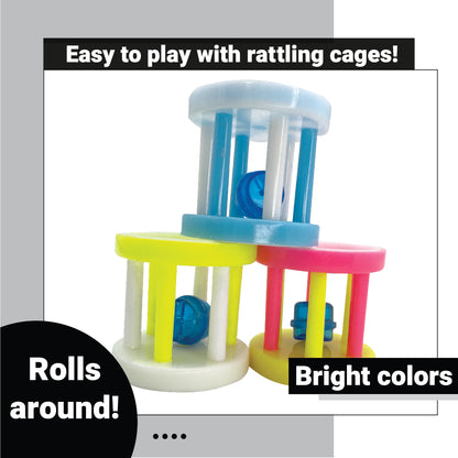 This playful toy features two lightweight plastic rolly cages, each enclosing a blue jingle ball that softly rings when touched. The top and bottom of each cage are molded in bold colors—blue, pink, and yellow—with contrasting swirl details that grab visual attention. The jingle sound inside encourages curiosity, while the open-bar design allows birds to easily grip the toy with their feet or beaks.