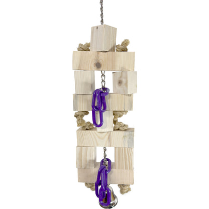 At the top, a sturdy quick link and heavy-duty chain allow for secure hanging inside any cage. The toy’s structure features stacked natural wood blocks made from kiln-dried, heat-treated spruce, pine, or fir—each chosen for its strength and bird-safe quality. Woven throughout the blocks is thick sisal rope, providing tactile variety and perfect grip for pulling and chewing. Bright plastic chains add extra movement and visual excitement, creating multiple areas for interaction.