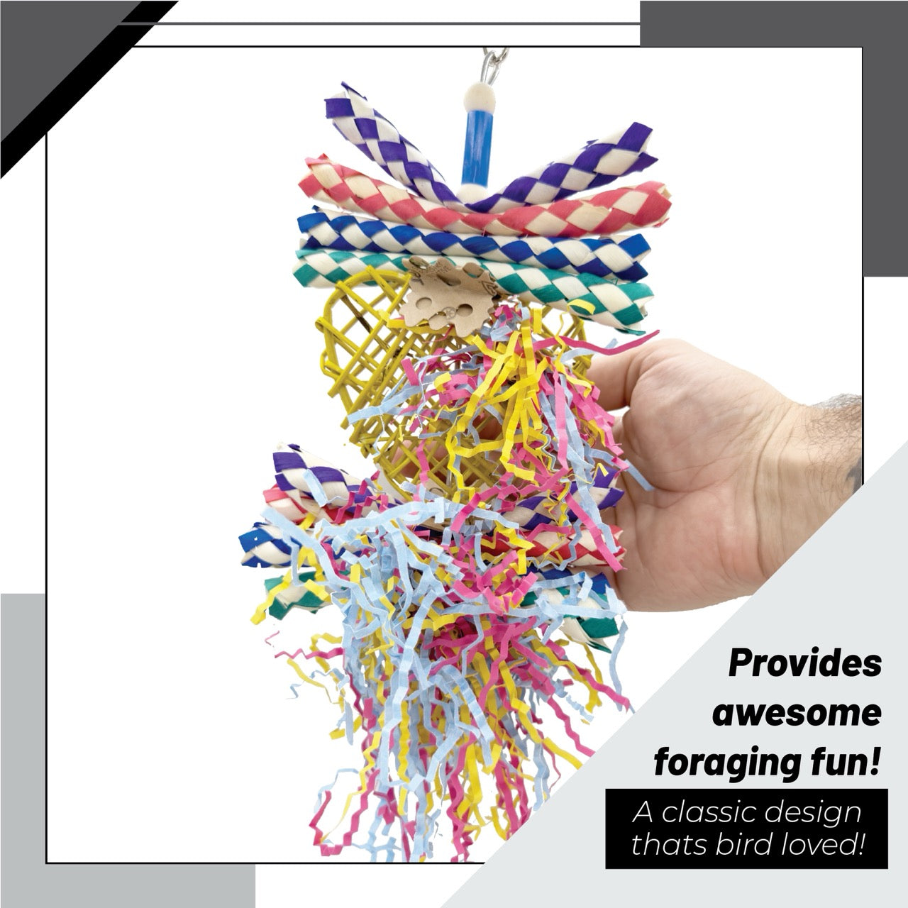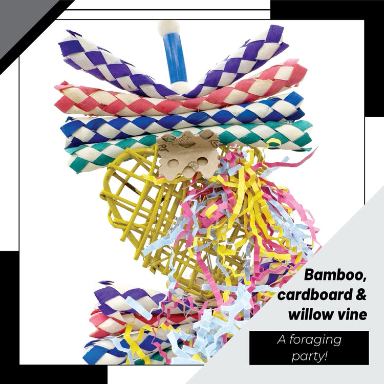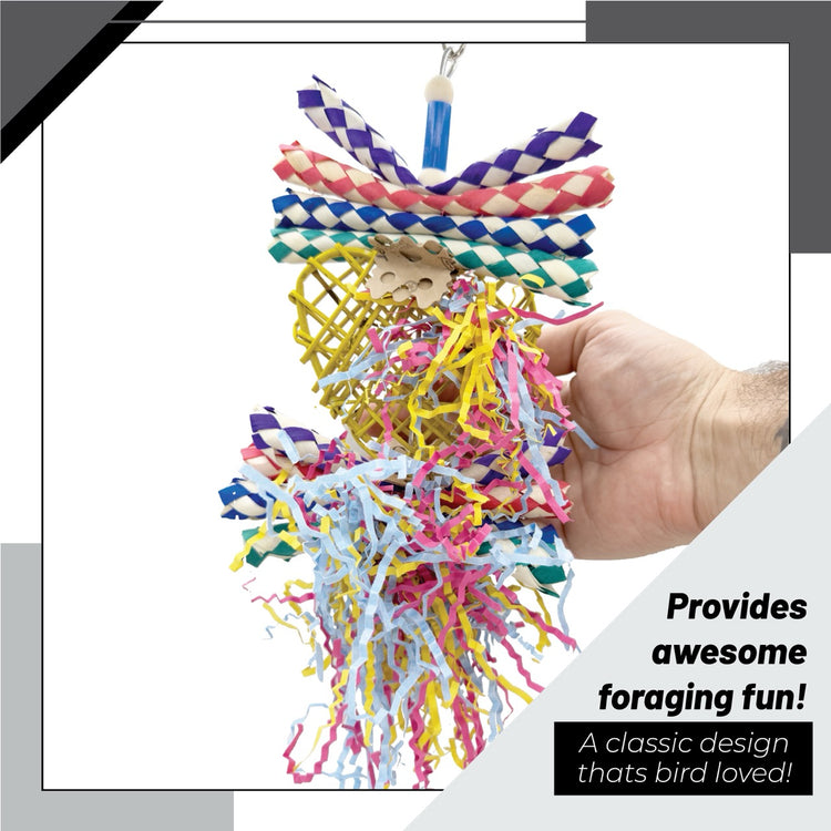 Further enhancing the fun, colorful crinkle paper streamers are threaded throughout, dangling and fluttering with every peck and tug. These vibrant elements encourage curiosity, activity, and foraging behavior while also helping reduce cage boredom. All materials are chosen to be bird-safe, chewable, and enticing.