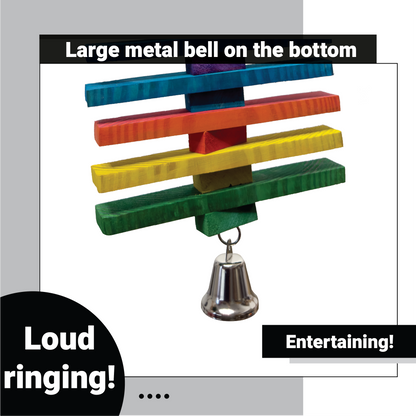 The toy starts with a strong metal quick link connector at the top for easy hanging. Attached to a vertical metal chain, an alternating pattern of dyed wood slats and rectangular blocks is stacked tightly to form a tall, ladder-like structure. At the base, a ringing metal bell adds interactive sound stimulation with every movement, encouraging continued play.