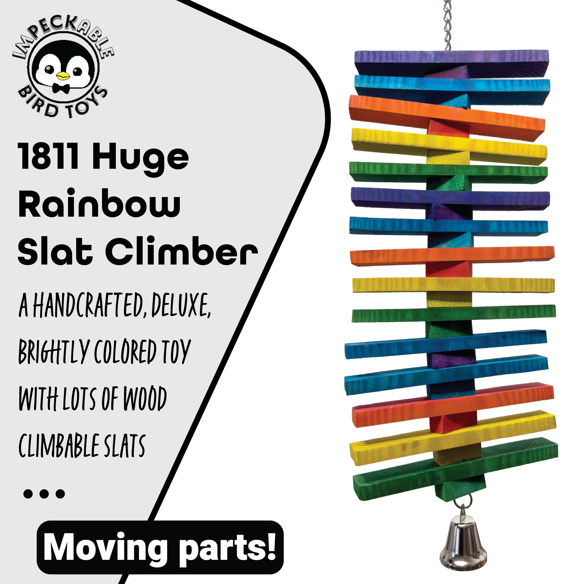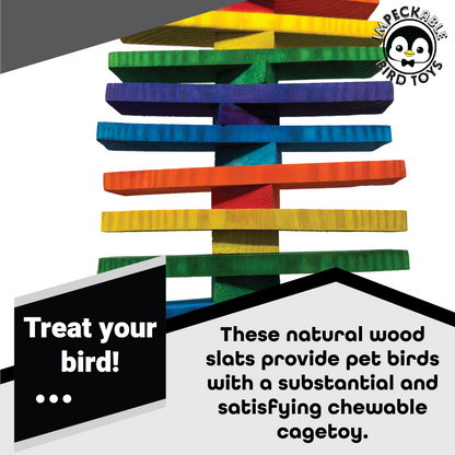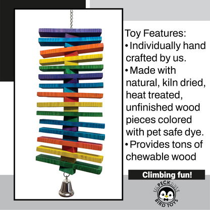 Introducing the 1811 Huge Rainbow Slat Climber from Impeckable Bird Toys. This towering and colorful toy is designed to bring dynamic enrichment through climbing, chewing, and cage activity for parrots that need big fun.