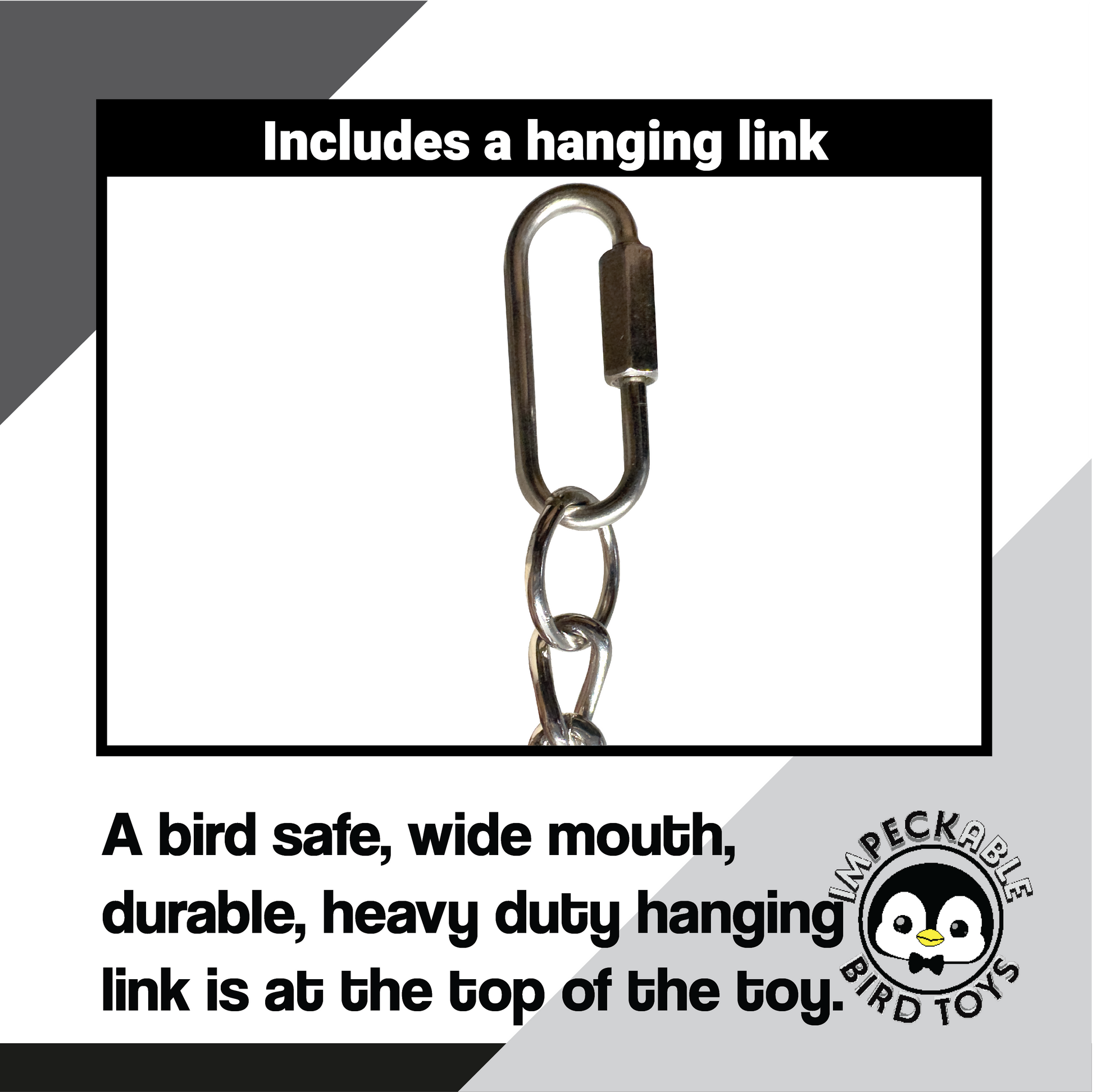 These toys are designed to hung from a bar or rung in a birds cage. Each medium bird cage toy includes at least one quick link hanging connector for fast installation in the aviary.