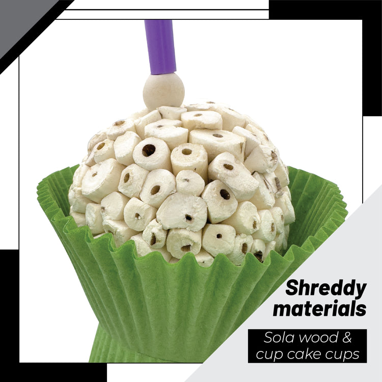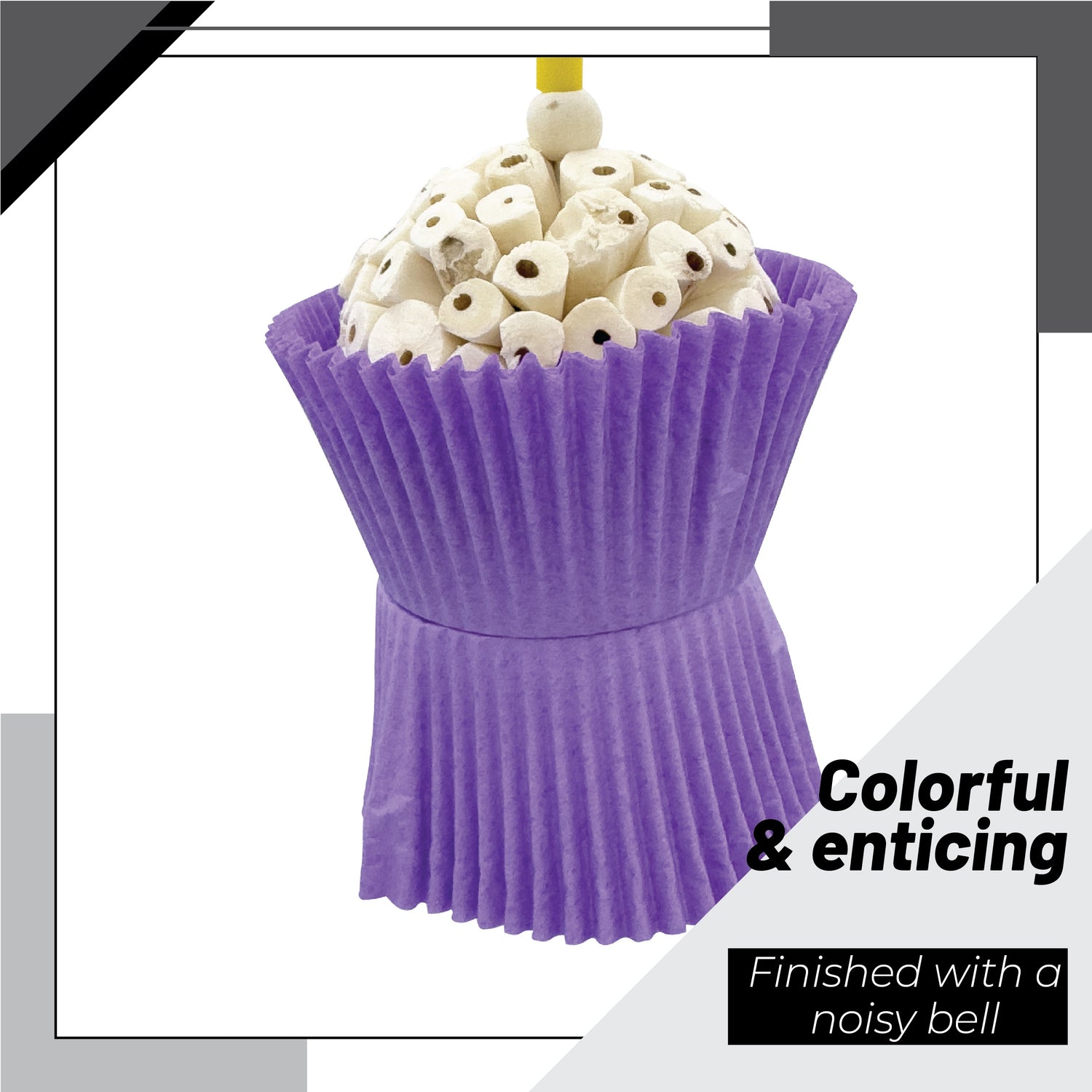 The toy begins with a sturdy quick-link connector for easy and secure cage installation. From there, a strong vertical wire suspends the sola wood ball—a favorite among birds for its soft texture that’s satisfying yet gentle on beaks. The layered cupcake liners provide additional fun for birds that love to pull, nibble, and shred.