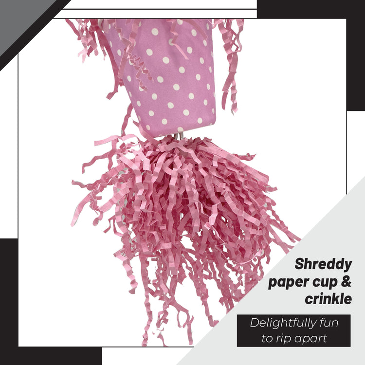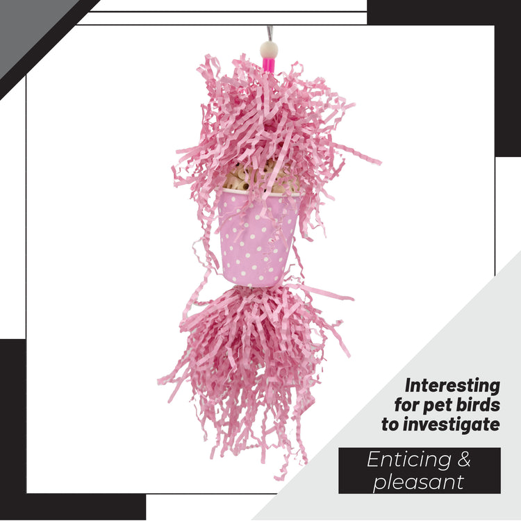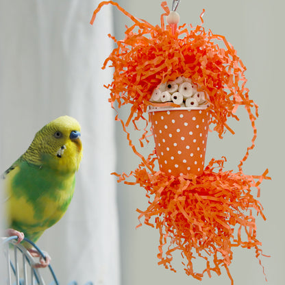 Each cup features a decorative polka-dot pattern and is filled with a generous amount of crinkle paper bursting from both ends. At the center is a soft sola wood core, offering a gentle, chewable material that birds find highly satisfying. The combination of textures—from the fluttery paper to the soft sola—encourages birds to shred, dig, tug, and forage.