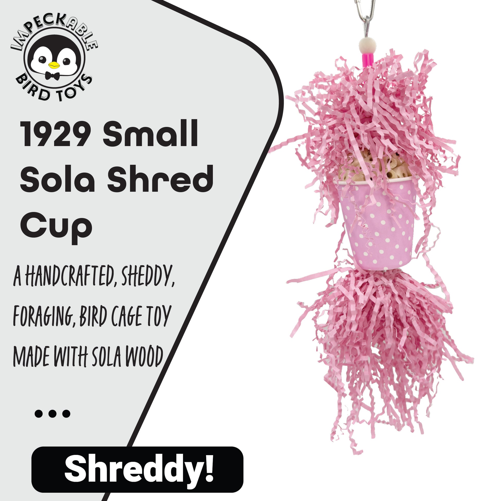 Introducing the Small Sola Shred Cup from Impeckable Bird Toys. Available in two charming color options—Orange (1941) and Pink (1929)—this vibrant hanging toy is designed to stimulate natural instincts and deliver joyful play for your feathered companion.