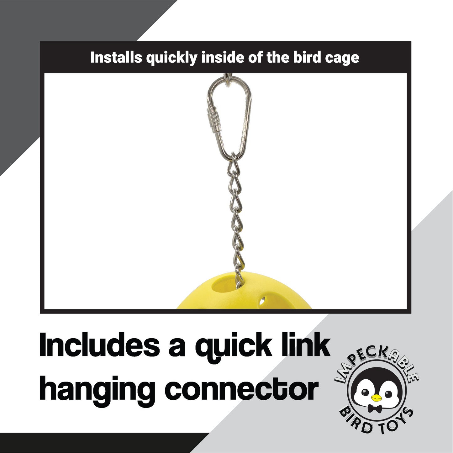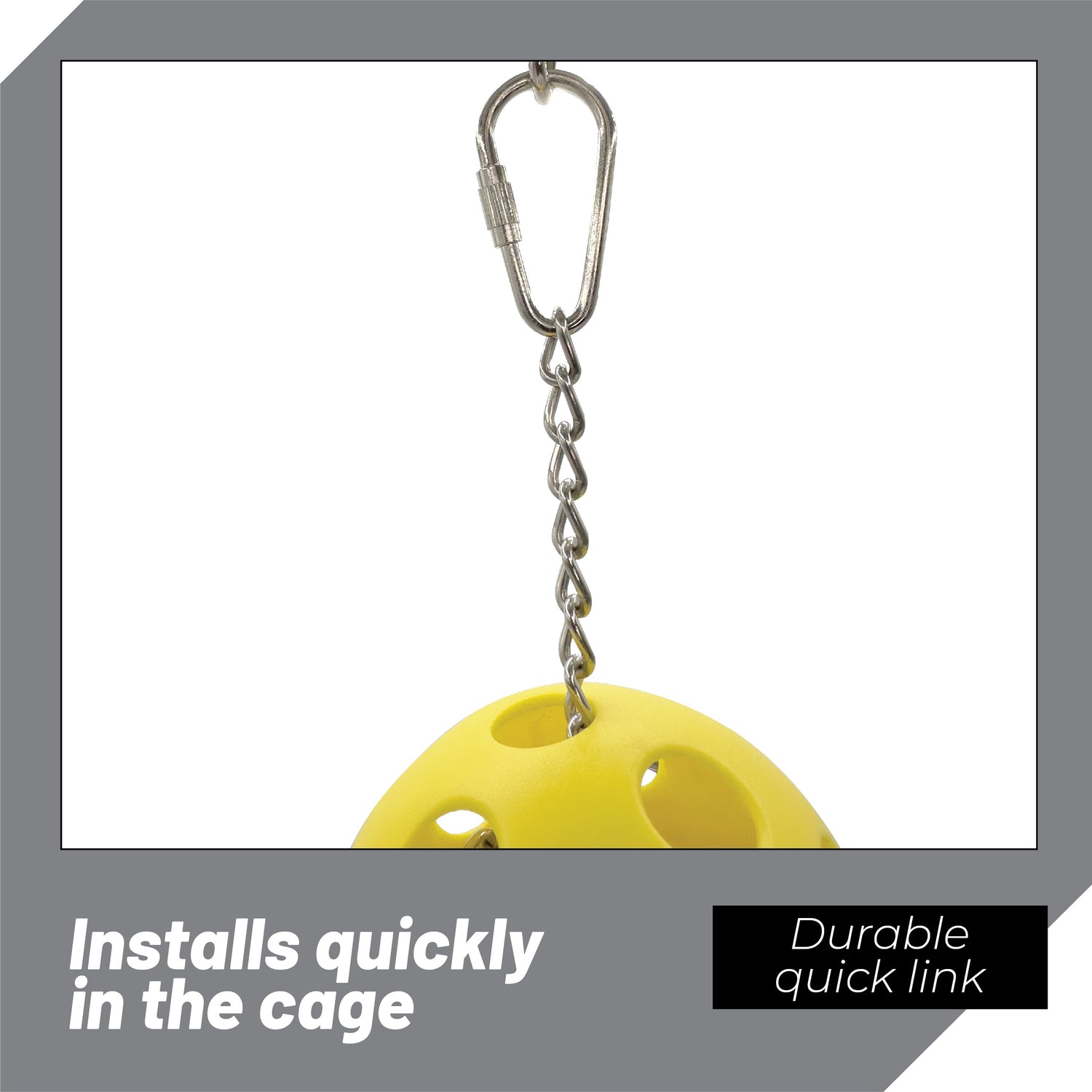 The toy starts with a durable nickel-plated quick link, offering secure and easy attachment to any cage setup. Below this, a metal chain connects to a plastic perforated ball (color may vary), which serves as the core of the toy. Its many holes allow birds to grip, peck, and spin the toy, promoting interactive cage play.