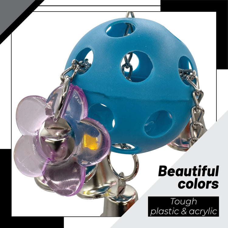 Hanging from the ball are multiple short chain legs, each holding a translucent acrylic flower charm. These flower-shaped accents are lightweight, brightly colored, and fun to tug or peck at. At the bottom of each flower is a small, shiny metal bell that rings softly when touched, adding auditory stimulation to the experience.