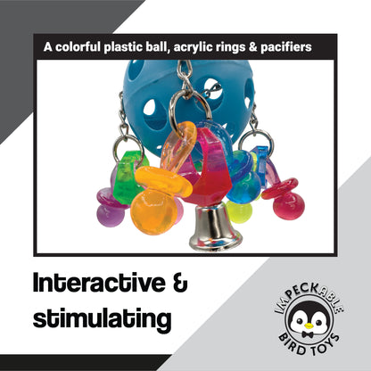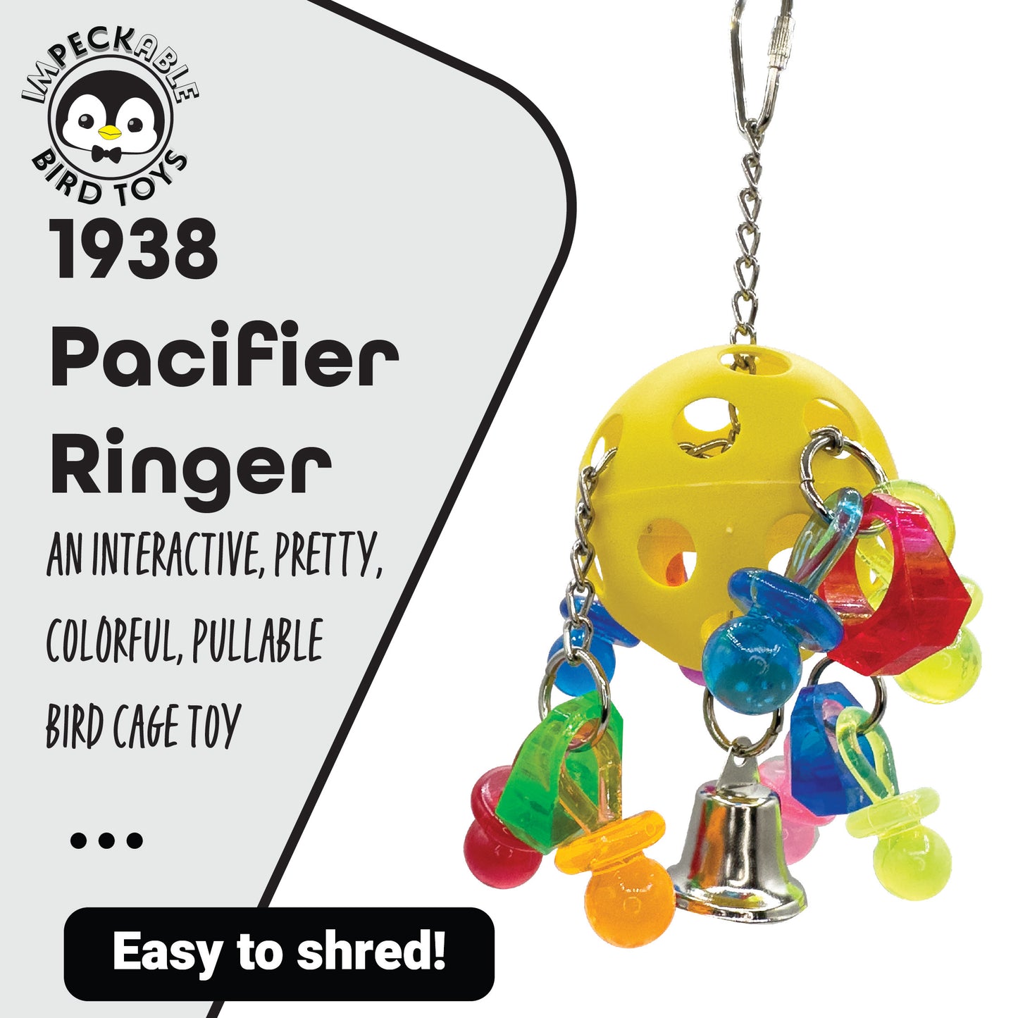 Introducing the 1938 Pacifier Ringer Bird Toy from Impeckable Bird Toys. This interactive hanging toy is packed with color, sound, and movement to keep your medium-sized bird happily engaged all day long.
