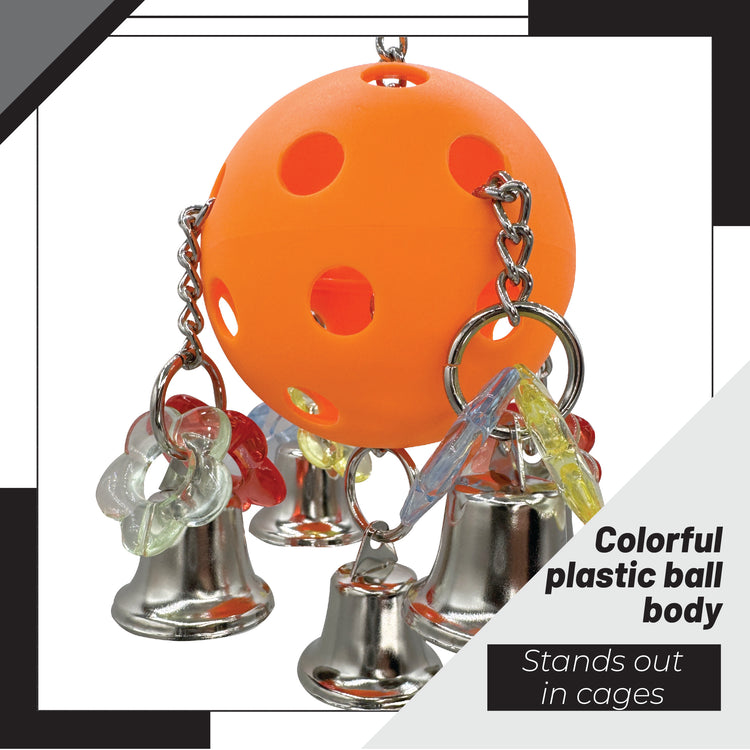 At the top, a secure metal quick link connects to a chain that supports a central perforated plastic ball. This bright, grabbable core offers beaks and feet a satisfying surface to explore. Attached to the ball are two lightweight chain legs, each ending in a jingly metal bell and acrylic flower charm.