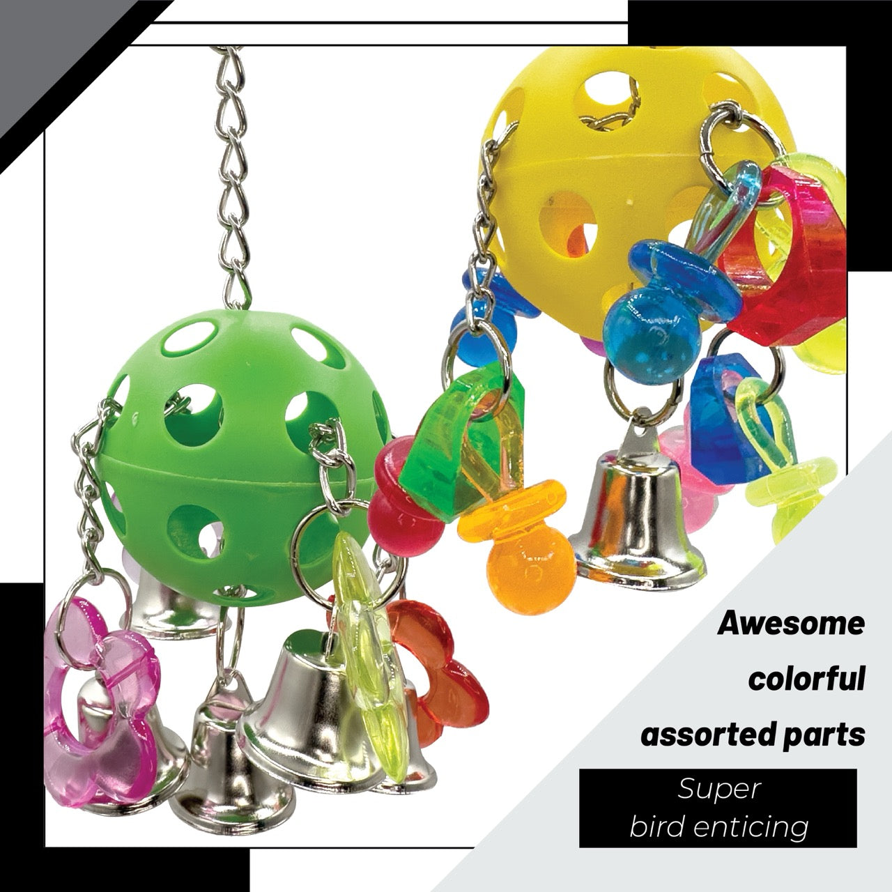 At the top of each toy is a sturdy quick link connector, which allows for secure and simple hanging in any birdcage. Hanging down from the plastic ball are metal chain legs that add swing, motion, and additional points of interest for birds to pull and climb. Each component is carefully chosen to encourage activity and satisfy a bird’s natural instincts.