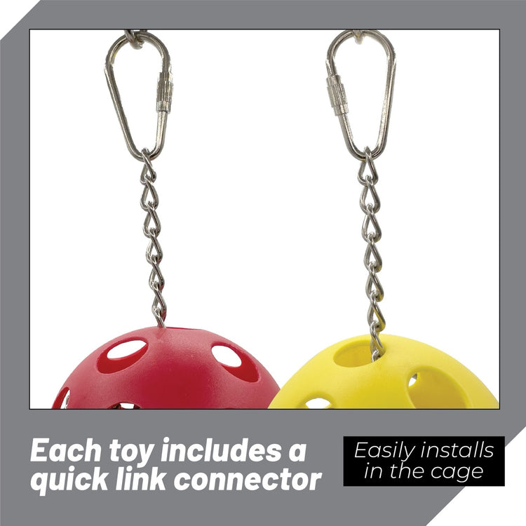 These toys are designed to hung from a bar or rung in a birds cage. Each medium bird cage toy includes at least one quick link hanging connector for fast installation in the aviary.