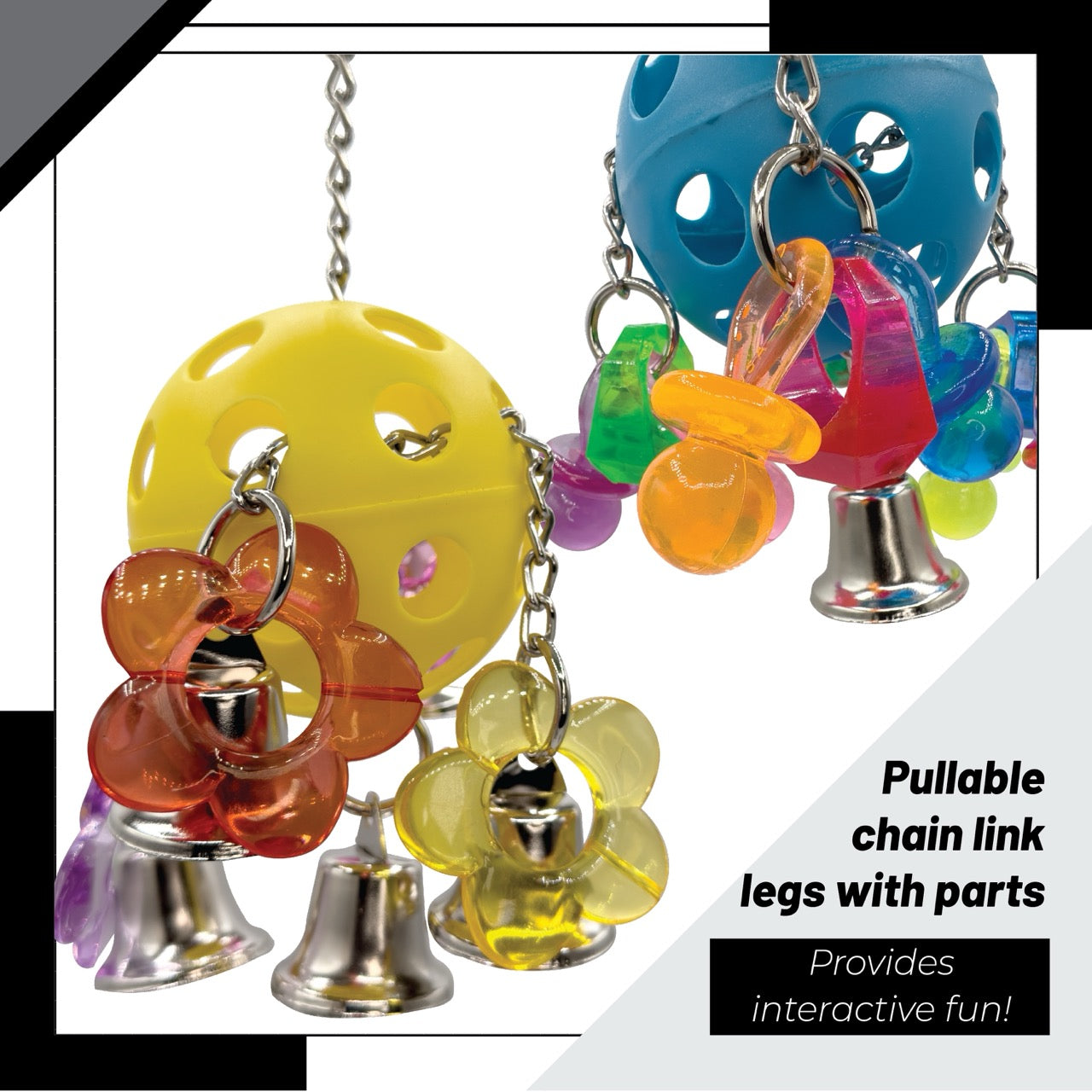 From top to bottom, each toy is designed for maximum engagement. The 1937 Flower Ringer features a plastic ball with multiple holes for easy gripping, adorned with colorful acrylic flowers and shiny metal bells that ring when touched. Chain link legs encourage pulling and tugging, promoting natural foraging behaviors. The 1938 Pacifier Ringer includes a plastic ball with dangling acrylic pacifiers and rings, ideal for chewing and exploration while supporting beak health. Both toys are lightweight and hang easily using secure metal clips, making them versatile for various cage setups.
