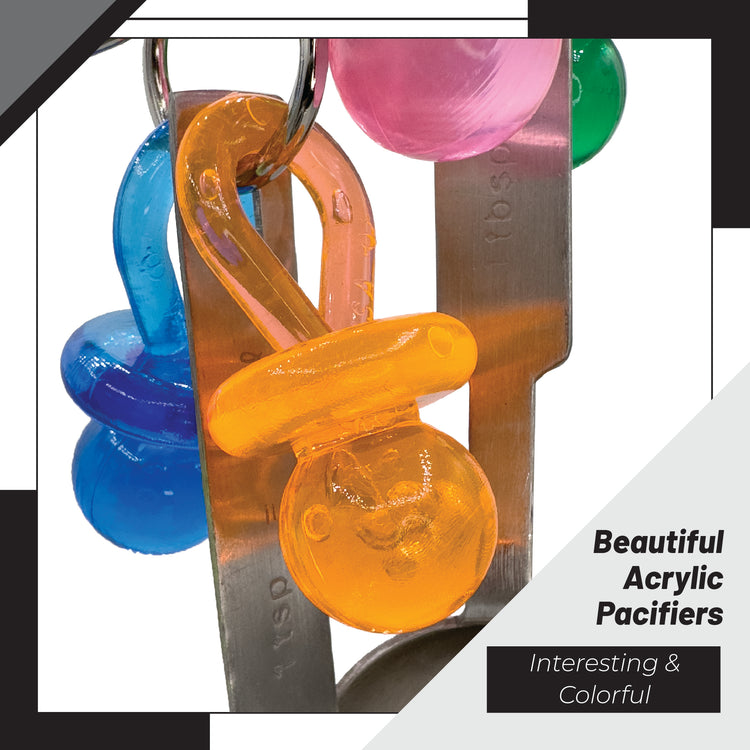 The 1968 Heavy Duty Spoon Pacifier Shine features colorful acrylic pacifiers, gleaming stainless steel spoons, and jingling bells, creating an exciting multi-sensory play experience. The bright, smooth pacifiers offer a fun texture for birds to peck, grip, and chew, keeping them mentally stimulated and engaged. Combined with the shiny spoons and gentle chime of the bells, this toy encourages exploration and active play, making it an enticing addition to any cage. Perfect for birds that love tactile and auditory stimulation, this toy delivers endless entertainment and enrichment.
