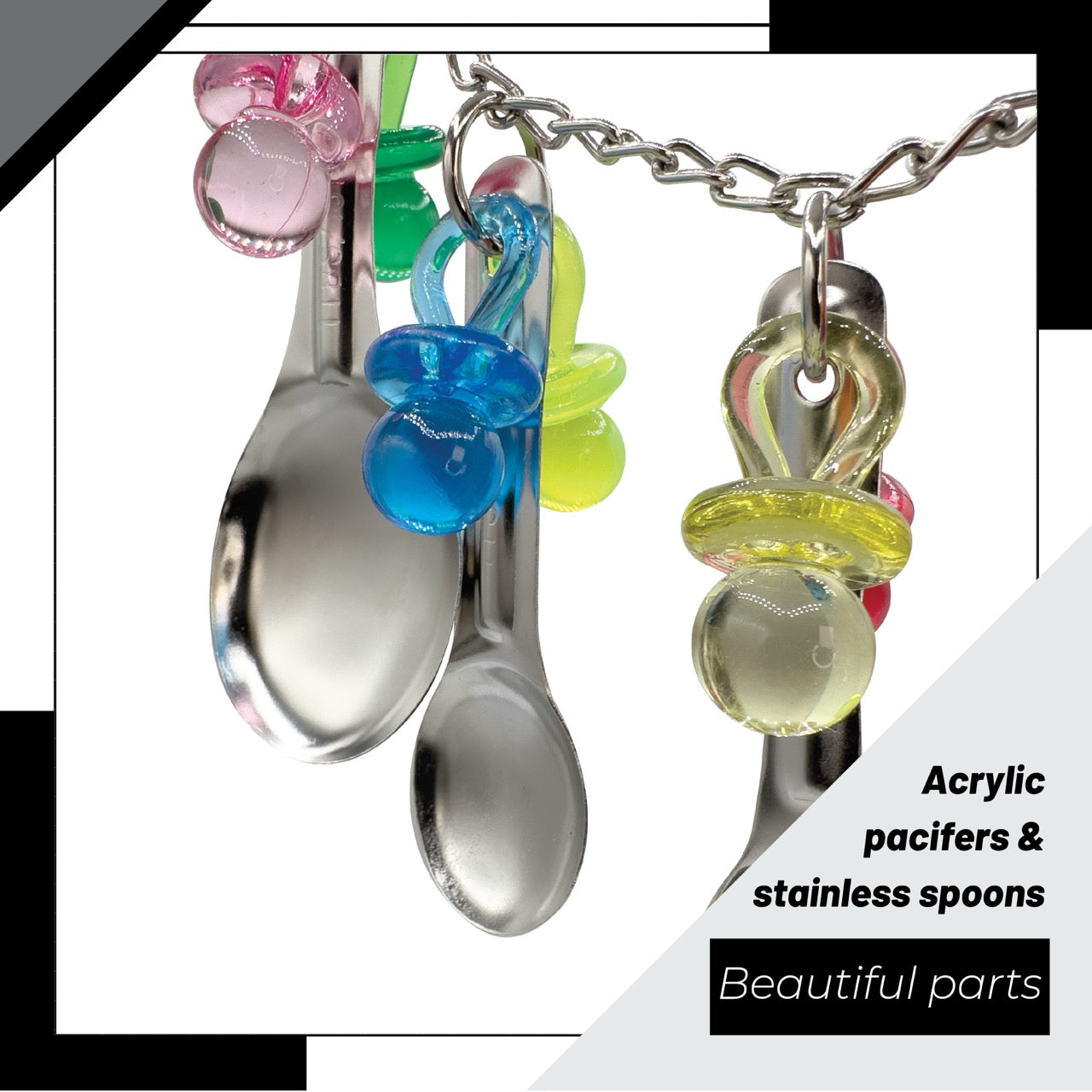 Introducing the 1969 Spoon Pacifier Shine from Impeckable Bird Toys, a mesmerizing, shiny, and colorful bird toy designed to brighten up any birdcage and engage your feathered friend. This fun and functional toy provides a variety of stimulating experiences for birds who enjoy movement, sound, and sparkle.