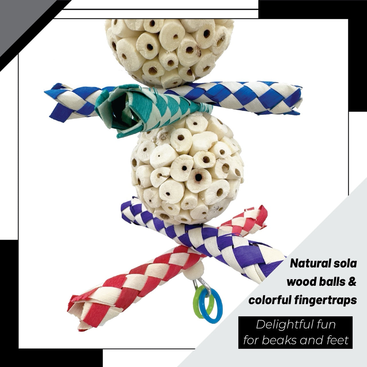 At the top of the toy, a sturdy quick link allows for secure and easy hanging in any cage. The toy is built on a strong internal wire and features two stacked sola wood balls. Each ball measures about 2.4 inches and offers a soft, shred-friendly texture that’s gentle on small bird beaks. Between and around the sola balls are bright bamboo finger traps, creating chewable and pullable layers. At the base, colorful plastic rings swing freely, adding a playful motion and sensory variety to the toy.