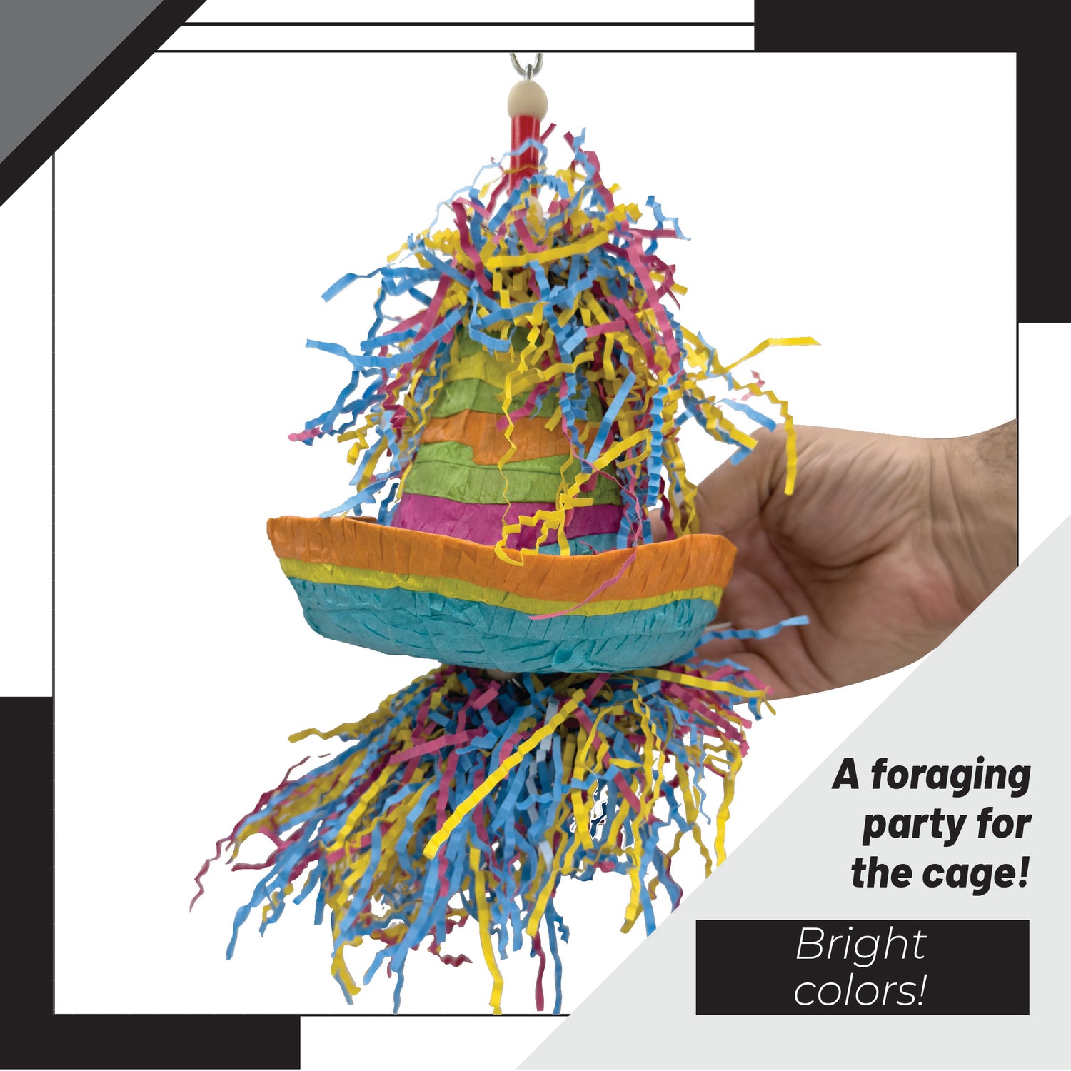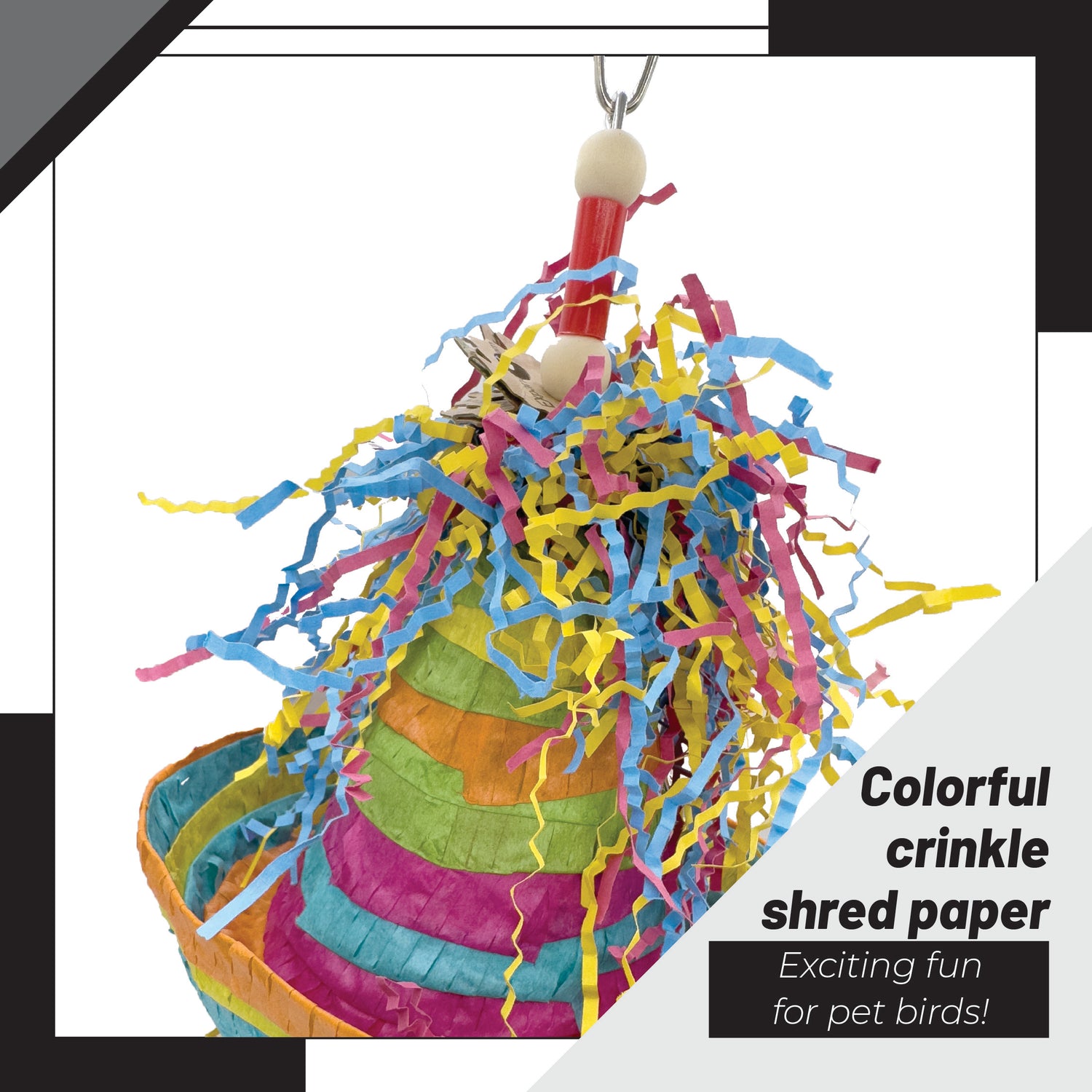 The toy begins with a durable quick link connector at the top, making it simple to hang securely inside any cage. A bright hat-shaped pinata sits at the center, crafted with natural paper in layers of festive colors. Radiating from the top and bottom are bundles of lightweight crinkle paper streamers that dance with every peck and pull, attracting your bird’s attention with color and motion.