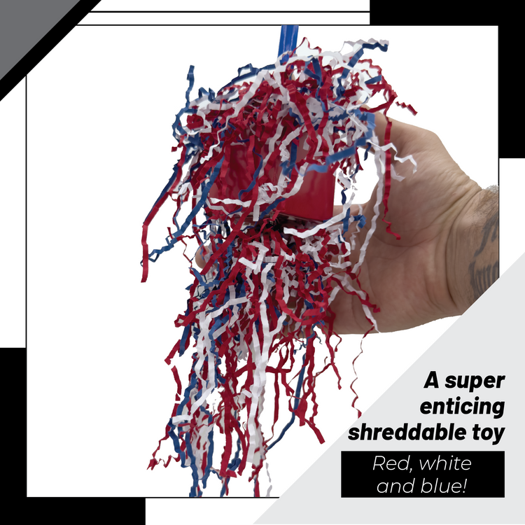 Introducing the 2199 USA Shreddy Box from Impeckable Bird Toys. This colorful and interactive toy is bursting with patriotic red, white, and blue materials that bring festive flair and shredding fun to any cage setup.