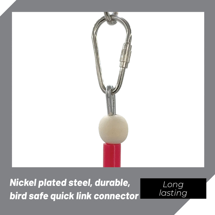 These toys are designed to hung from a bar or rung in a birds cage. Each small bird cage toy includes a quick link hanging connector for fast installation in the aviary.