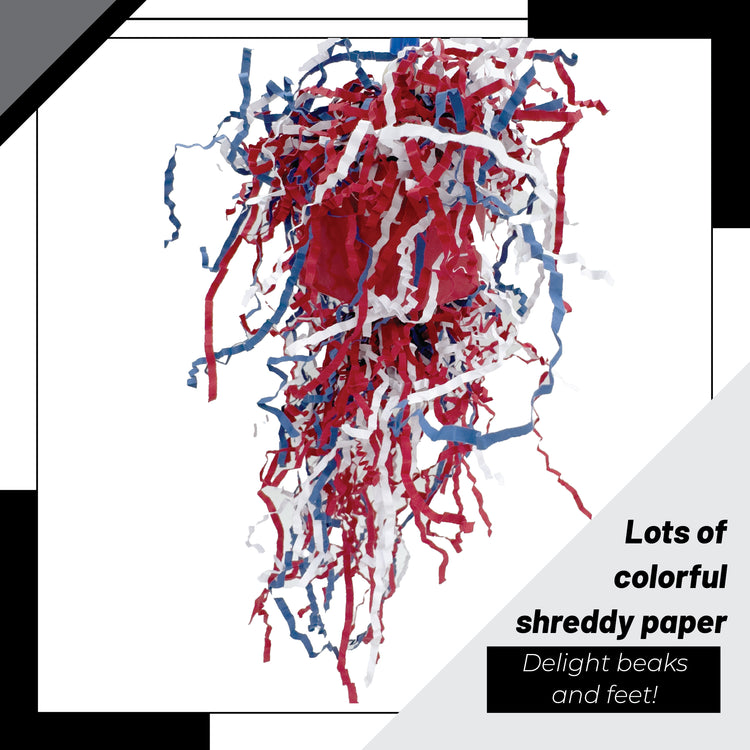 The 2199 USA Shreddy Box is specially crafted for small pet birds such as Budgies, Parrotlets, Lovebirds, and Finches. Its compact and lightweight design makes it easy for little beaks to explore, shred, and enjoy. Handcrafted in Florida, this toy is made entirely from bird-safe materials, so you can feel confident adding it to your bird’s daily play routine. From the festive red, white, and blue colors to the crinkle paper and cupcake liner textures, every element is chosen to promote active engagement and natural behaviors like foraging and beak conditioning. Whether you're celebrating a holiday or just brightening your bird’s everyday environment, this toy delivers both fun and functionality. It easily installs with a secure metal quick link and fits perfectly in most small cages. Give your bird a cheerful, stimulating experience that helps keep them happy, active, and entertained all day long.