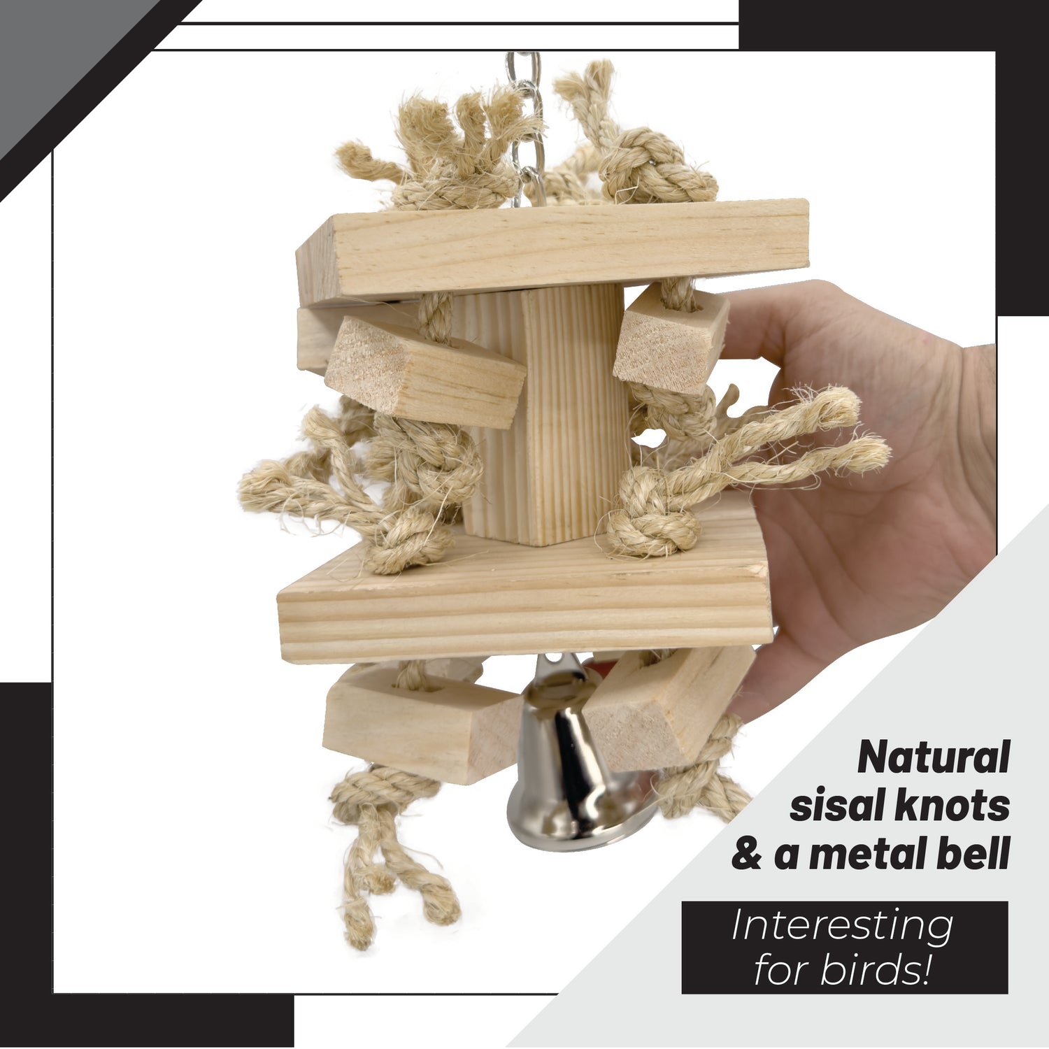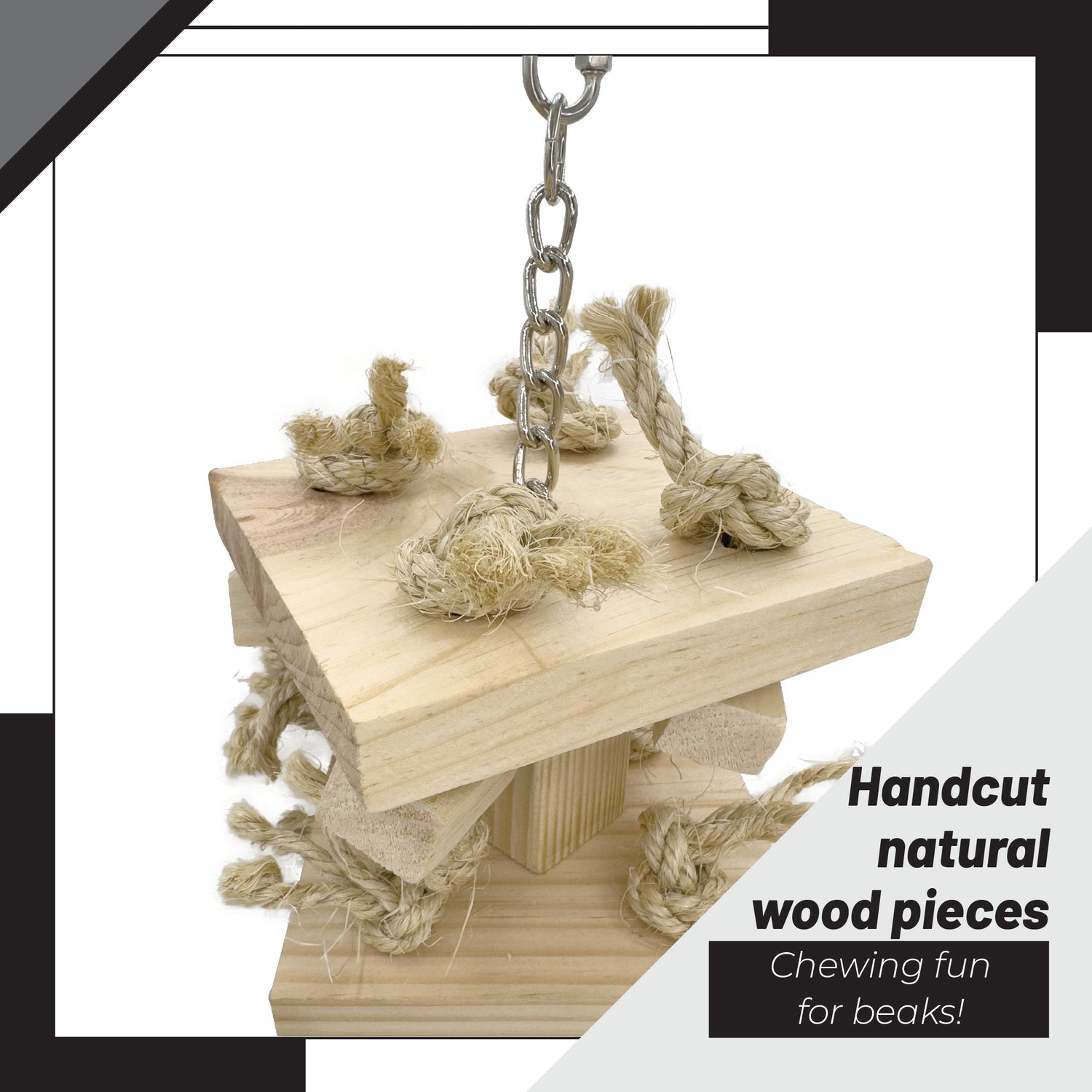 At the top, a metal quick link allows for fast and secure hanging inside any cage or aviary. A sturdy chain runs through the toy’s core, threading through large natural wooden blocks arranged in a tower-like shape. Each block is paired with sisal rope knotted through and around the layers, creating multiple levels of tactile fun.