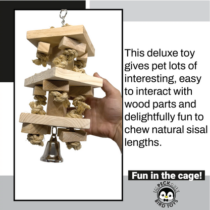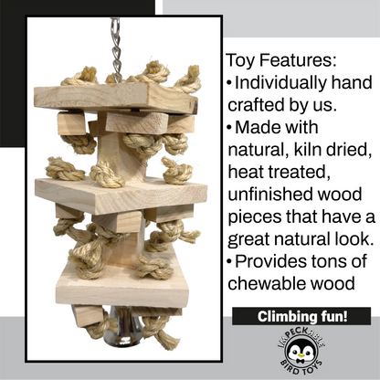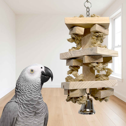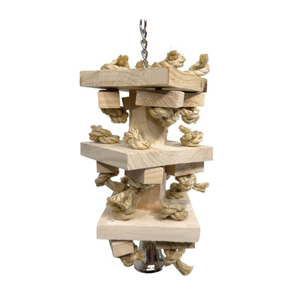 The toy begins with a heavy-duty quick link at the top, allowing for easy and secure cage installation. A sturdy metal chain runs through the center, anchoring multiple layers of thick, untreated wooden blocks. These blocks are connected and spaced with tough natural sisal rope tied into thick knots, offering grip, resistance, and a satisfying challenge for busy beaks.
