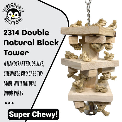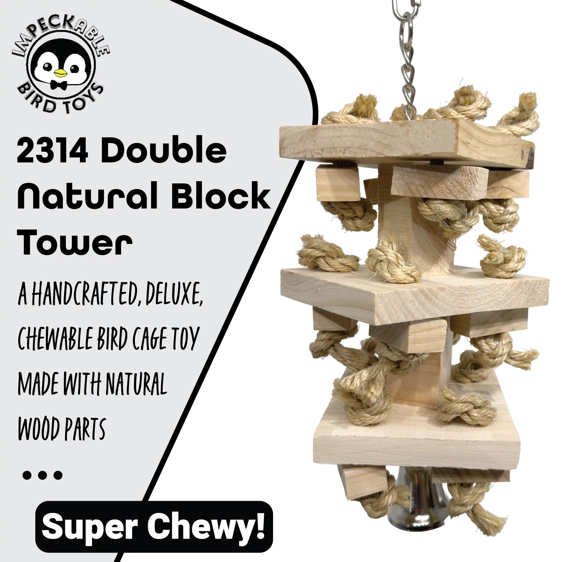Introducing the 2314 Double Natural Block Tower from Impeckable Bird Toys, a powerful and engaging chew toy built to satisfy the instincts of medium to large parrots. Designed for birds that love to pull, climb, and shred, this handcrafted toy offers a perfect blend of durability and natural texture.
