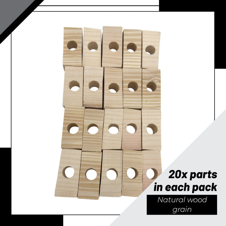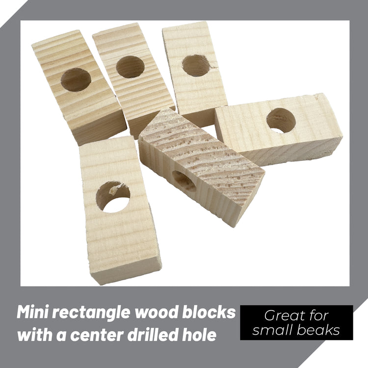 Each block is handcrafted from kiln-dried, heat-treated softwood, selected for its lightweight structure and bird-safe texture. The block measures 2 inches long, 1 inch wide, and half an inch thick. A centered drilled hole runs cleanly through each block, giving builders flexibility to connect them with rope, wire, or leather in creative ways.