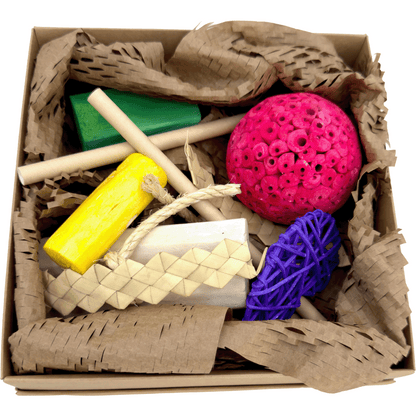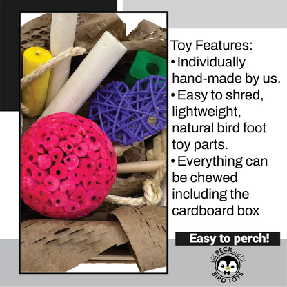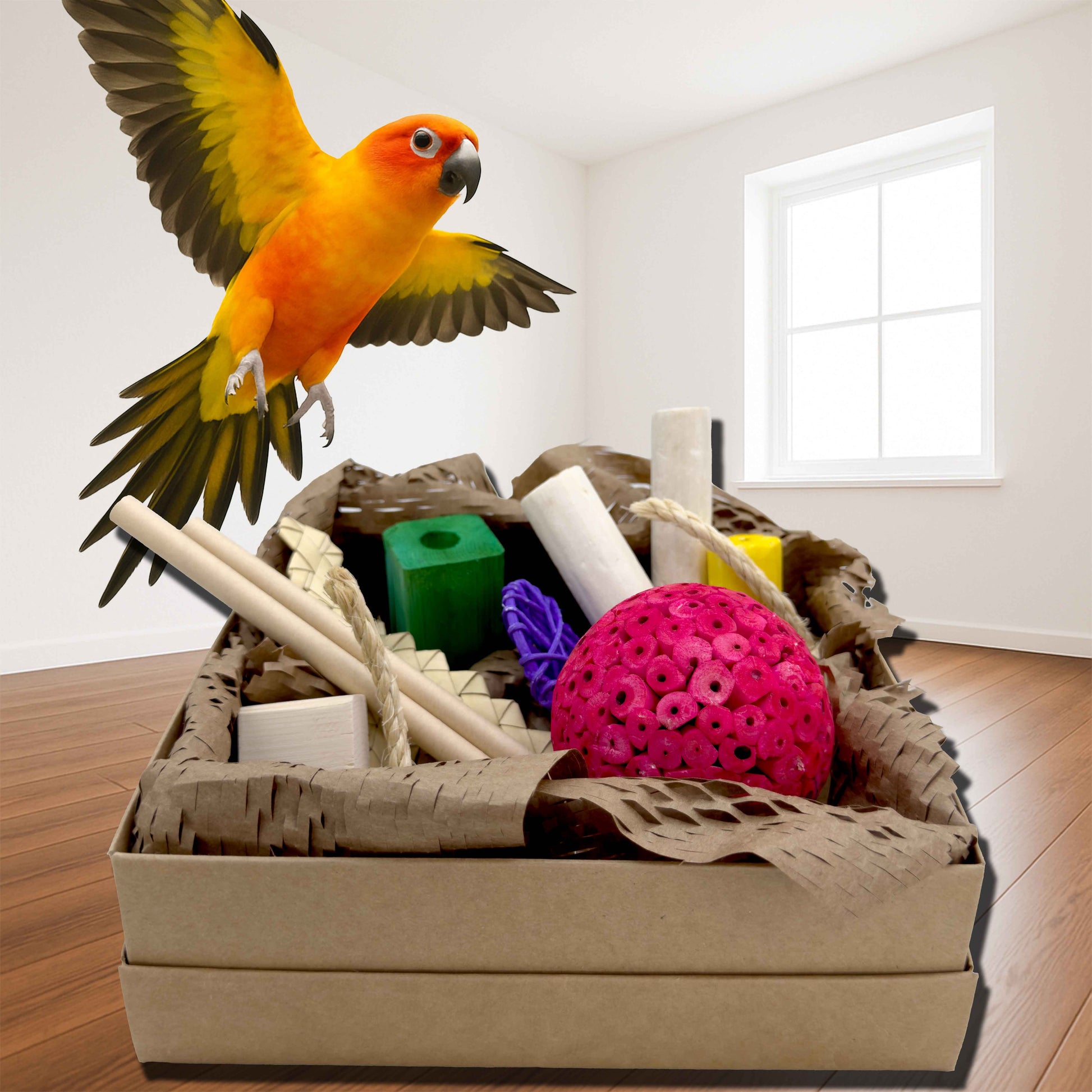 Each box is packed with soft and safe bird-friendly materials, including a bright pink sola wood ball, a purple vine heart, palm fiber, vine rope, sola wood blocks, and paper straws. These lightweight pieces are layered over a cozy honeycomb kraft paper base, enhancing the tactile experience and encouraging digging and exploration.