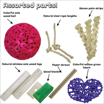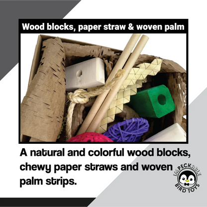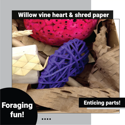 Starting from the top, birds will find irresistible items they can easily pick up, toss, chew, and manipulate with their feet or beak. The sola ball offers a soft chewable texture, while the vine heart and fiber strands create variety in shape and feel. The paper straws and kraft filler round out the box with shreddable fun.