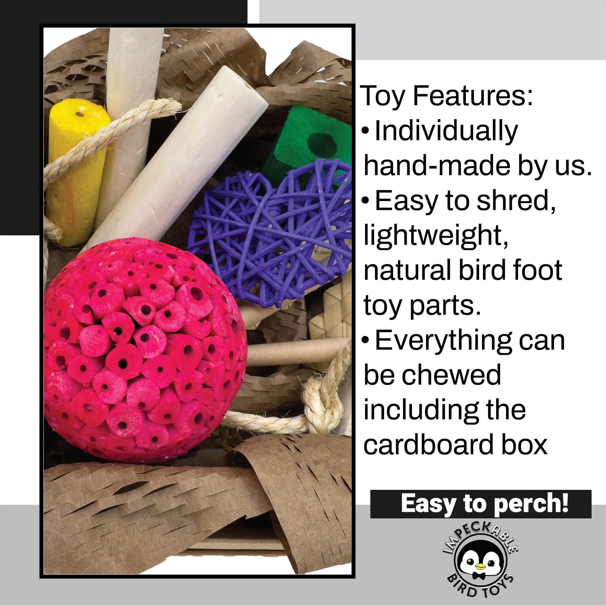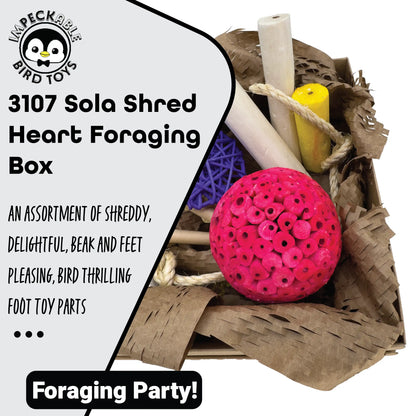 Introducing the 3107 Sola Shred Heart Foraging Box from Impeckable Bird Toys. This vibrant and interactive toy box is designed to delight birds with chewable textures and engaging colors.
