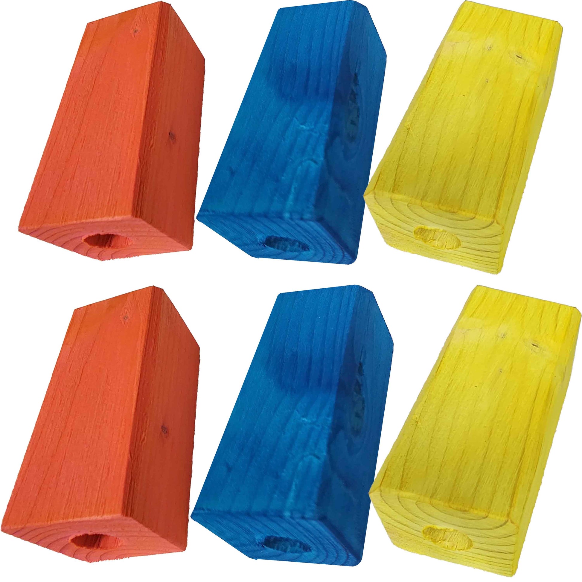 Each block is carefully handcrafted from kiln-dried, heat-treated spruce, pine, or fir—lightweight yet strong woods selected for their safe texture and satisfying chew resistance. The set includes two blocks each in orange, blue, and yellow, adding a rainbow touch to your bird’s daily play routine.
