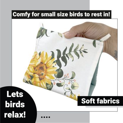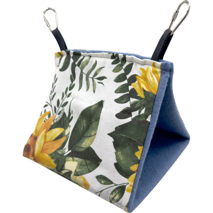 From top to bottom, the hut is designed to provide comfort and structure. The exterior is made from 100% cotton fabric in a nature-inspired, vibrant print, while the interior fleece lining ensures warmth and softness. Its triangular shape creates a secure nook for napping, resting, or enjoying solitude, helping birds feel sheltered and emotionally secure.