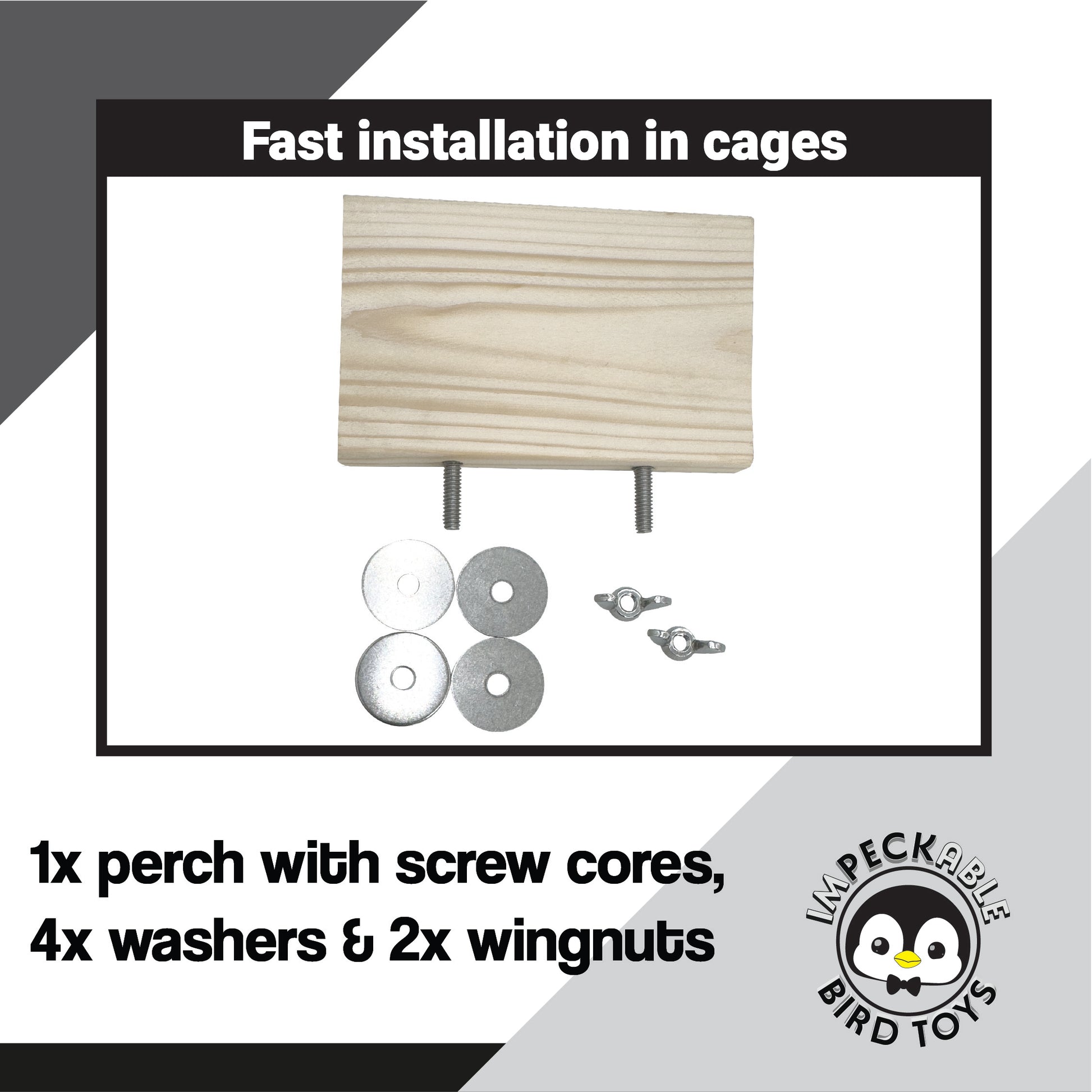 At the top of each perch is a threaded metal screw core set into the wood, secured in place with a dab of hot glue to prevent loosening. Washers and a wingnut are included, making it quick and easy to attach the perch to horizontal or vertical cage bars. With one perch for each side of the cage or two levels, your bird will have options for rest and play.
