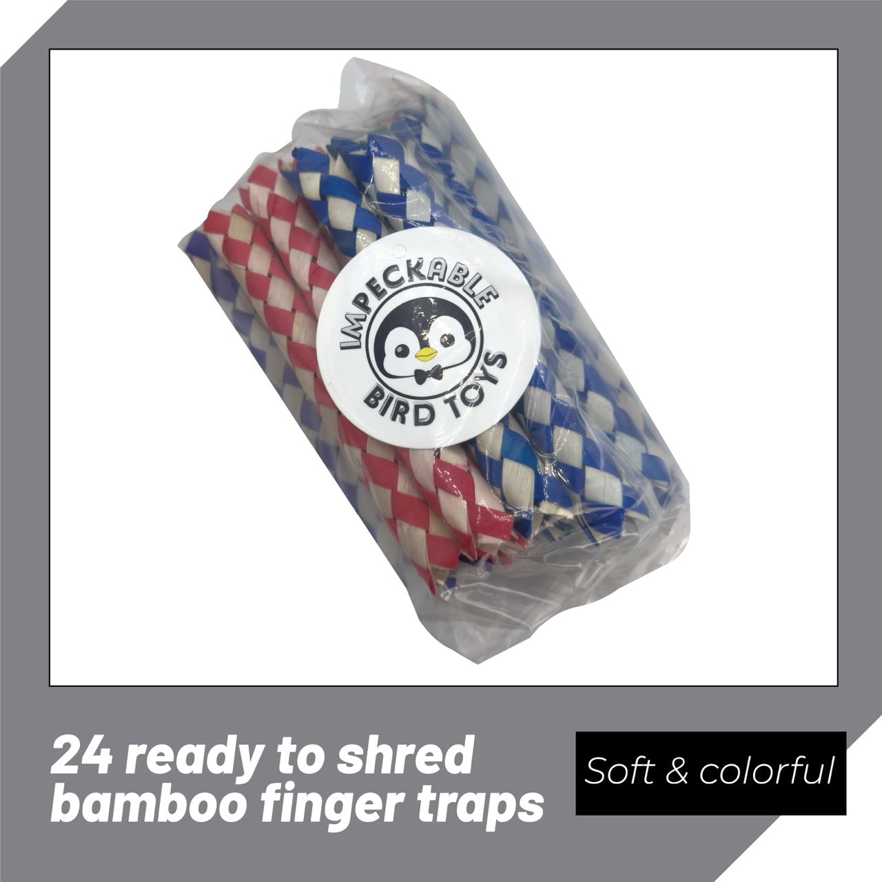 Introducing the Classic Bamboo Finger Traps from Impeckable Bird Toys, available in two convenient pack sizes the 702 Pk24 and the 703 Pk72. These finger traps are a fantastic way to entertain and enrich your bird’s environment, providing safe, natural materials for endless shredding fun. Both packs contain colorful, bird-safe bamboo finger traps that encourage natural foraging instincts and satisfy birds’ desire to chew and shred.