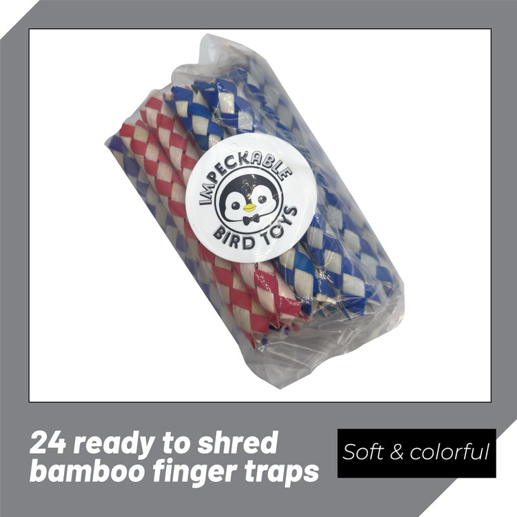 The 702 Pk24 Classic Bamboo Finger Traps come in a convenient 24-pack, offering ready-to-use enrichment for your feathered friend. Each bird-safe, lightweight bamboo trap is designed for shredding, chewing, and foraging play, keeping birds mentally stimulated and physically active. These vibrant traps add color and texture to any cage setup and can be used as standalone foot toys or incorporated into DIY toy creations. Individually packed in our Florida-based shop, they ensure quality and freshness with every pack.