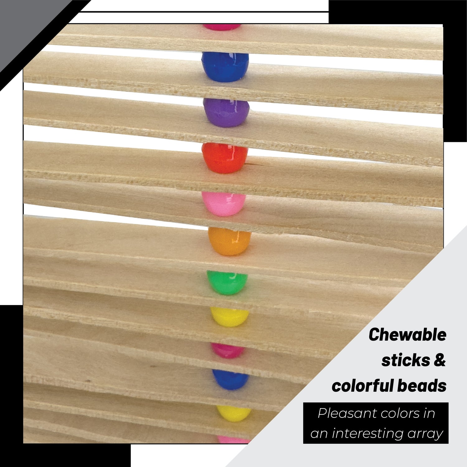 The natural wooden slats provide an ideal surface for gentle chewing, helping to maintain beak health. The smooth plastic beads in bright colors add visual stimulation and a tactile contrast, while the small rubber ring at the bottom adds an extra interactive element for birds to bat and pull.