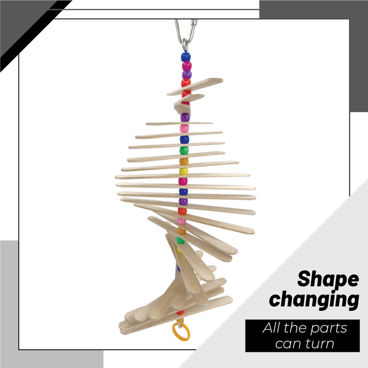 At the top, a secure quick link connector allows for simple attachment to cage bars or aviary walls. The body of the toy is built on a vertical wire, strung with alternating layers of lightweight chewable wooden slats and colorful plastic beads. These components are designed to rotate freely when touched, encouraging birds to peck, spin, or nudge them throughout the day.