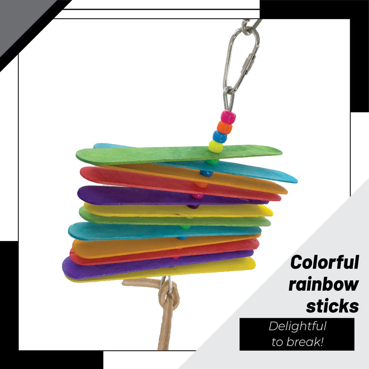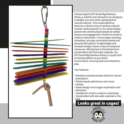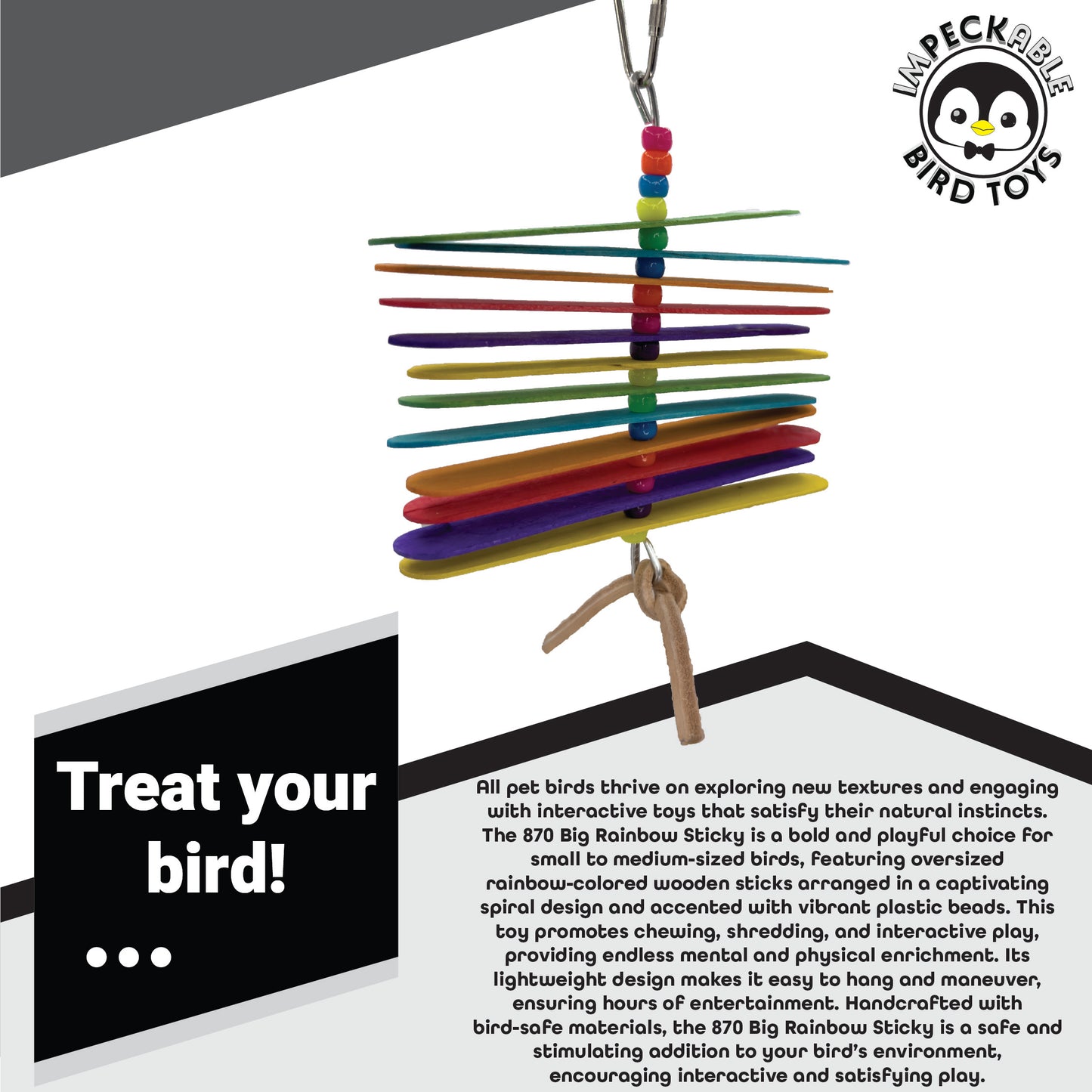 Introducing the 870 Small Big Rainbow Sticky from Impeckable Bird Toys—a bright and engaging toy designed to bring color and stimulation to your bird’s cage. With its spiral stack of rainbow-colored wooden sticks secured by vibrant plastic beads, this toy provides visual interest and satisfying textures that encourage chewing and foraging.