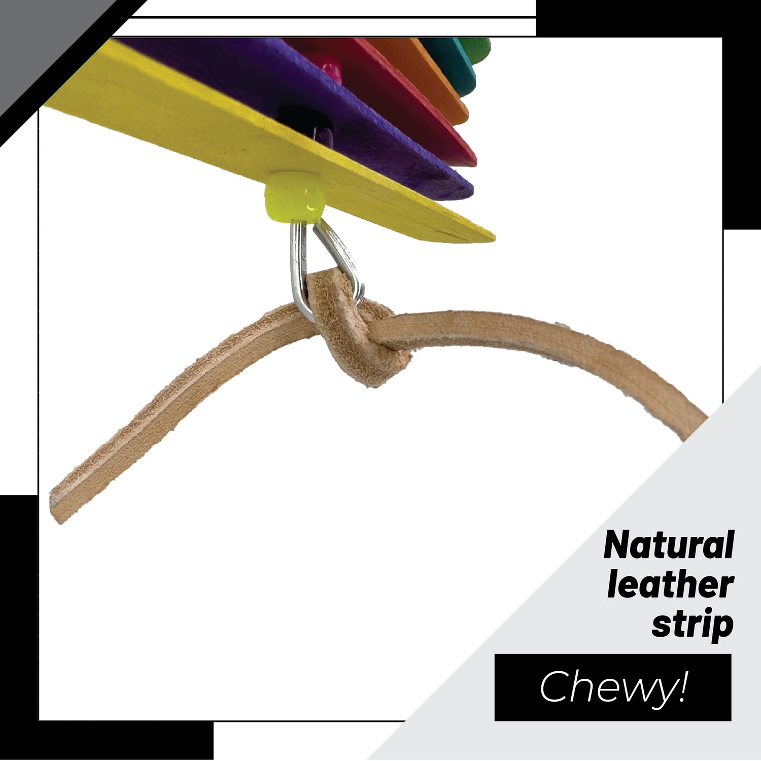 The 870 Small Big Rainbow Sticky includes a natural leather tie at the bottom, adding an exciting element for birds to chew, pull, and explore. This soft yet durable texture complements the vibrant wooden sticks, enhancing interactive play and foraging fun. Designed to encourage natural chewing instincts, the bird-safe leather provides a satisfying grip, making it perfect for small birds that love to shred and tug. The combination of colorful chewable sticks and engaging textures keeps birds mentally stimulated and physically active.