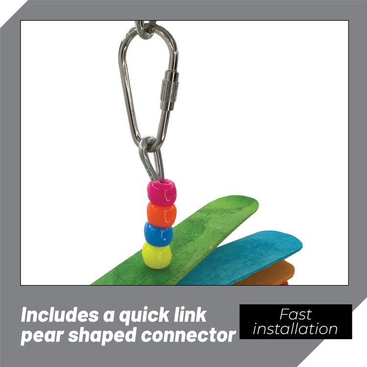 At the top, a sturdy metal pear-shaped quick link makes it easy to attach the toy to any cage. The core features dyed wooden slats arranged in a spiral pattern, creating a sense of movement and dimension. Each slat is separated by a plastic bead in bright, contrasting colors, enhancing both texture and appeal.