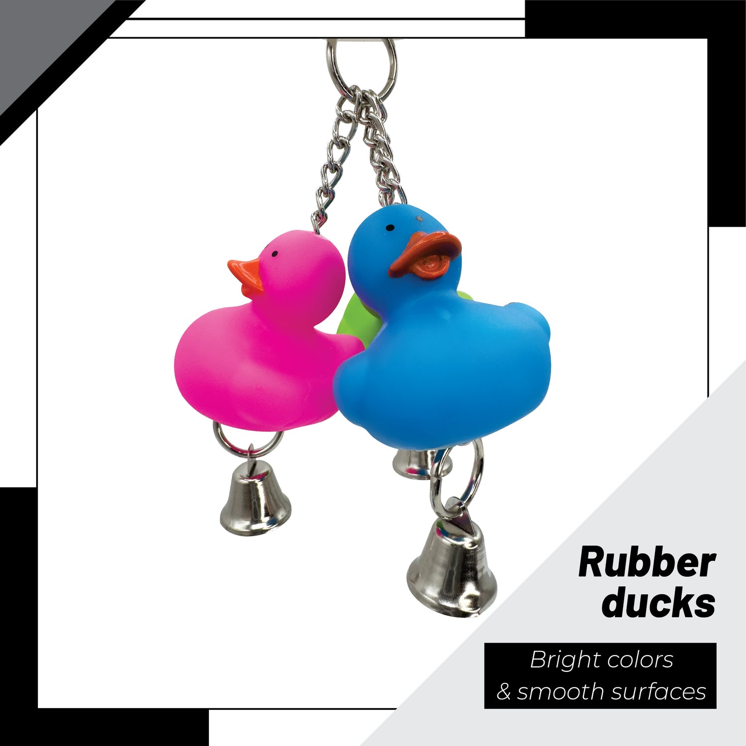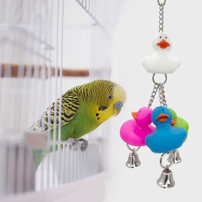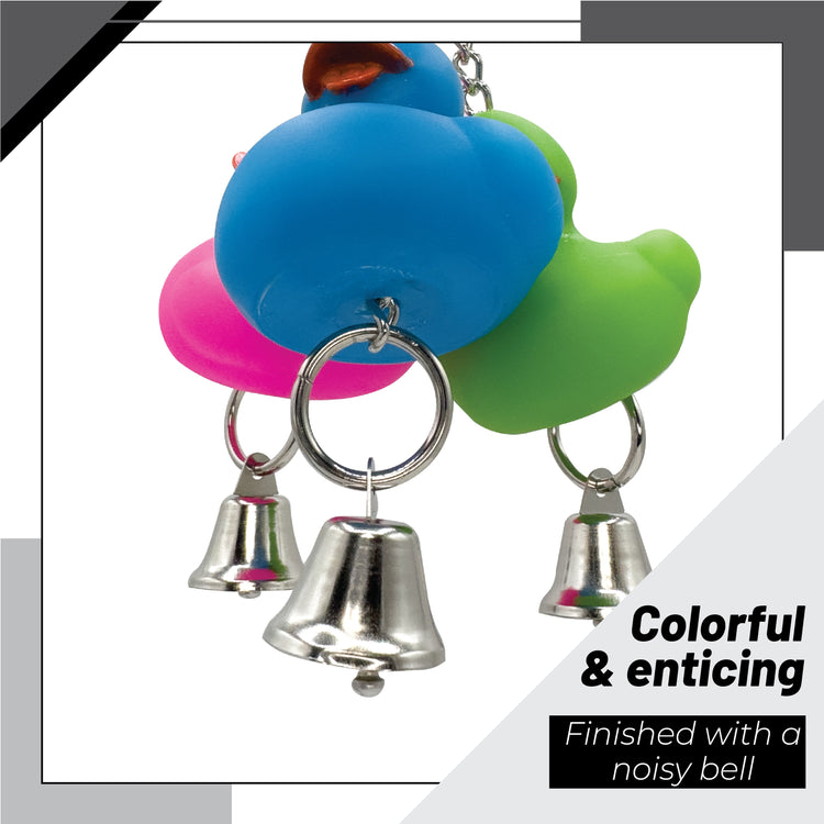 At the top, a secure quick link connector makes installation simple in most cage setups. A white rubber duck sits at the center, attached to a sturdy metal chain. From this point, three smaller colorful rubber ducks hang on separate chains below. Each duck is accented with a shiny metal bell that rings lightly with every movement. This combination of textures and sounds provides multiple ways for birds to engage and stay entertained. Ducks can have different colors, but they will always have a combination of four distinct colors.