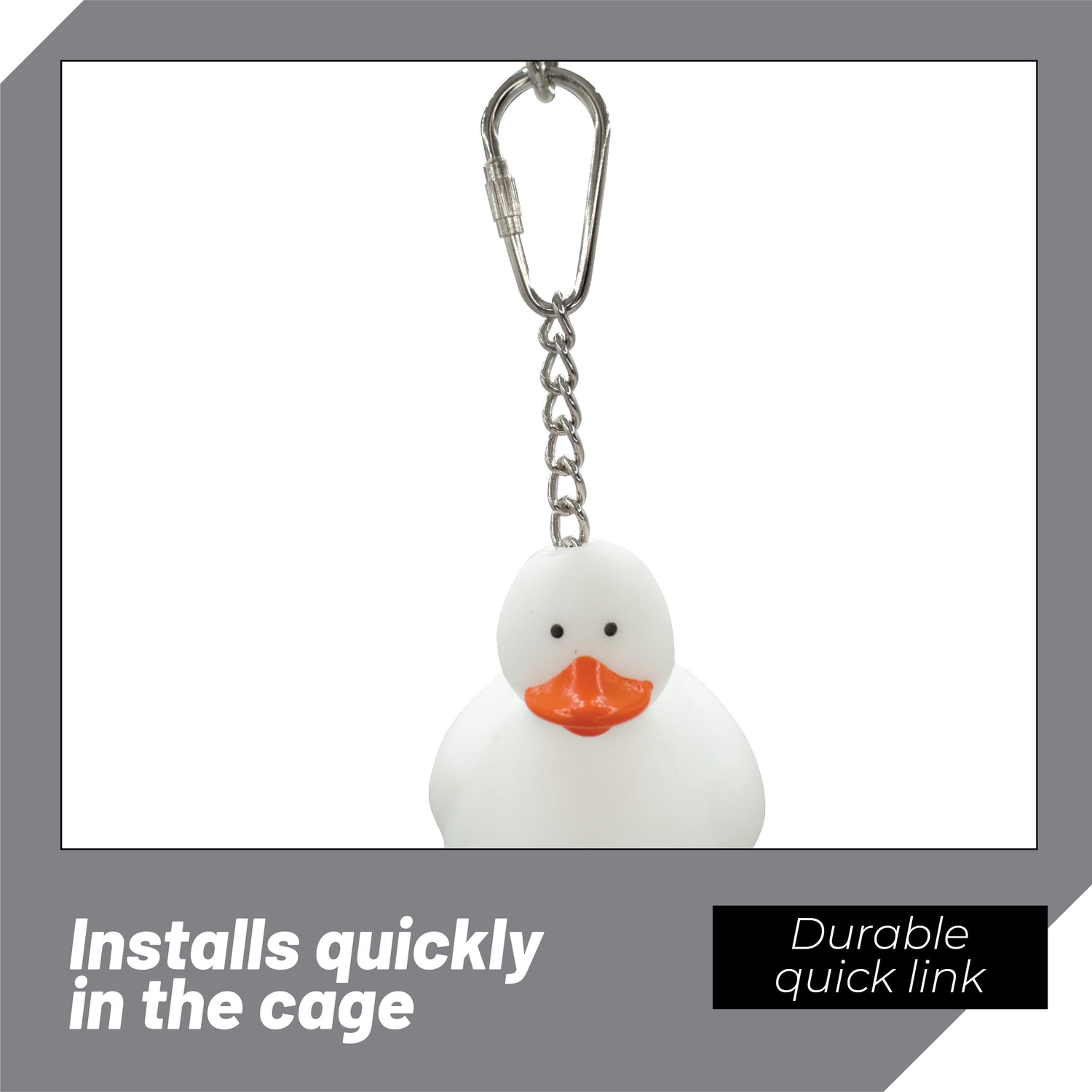 Each 922 Ducky Ringer includes a high-quality pear-shaped quick link connector, ensuring secure and easy cage attachment. Made from bird-safe, nickel-plated steel, this smooth, rust-resistant connector provides long-lasting durability, keeping the toy firmly in place for safe and interactive play. The easy-to-use finger barrel clasp offers a snug and reliable fit, preventing accidental detachment. Designed for quick installation and repositioning, this sturdy connector allows you to customize your bird’s cage setup with ease, making playtime more engaging.